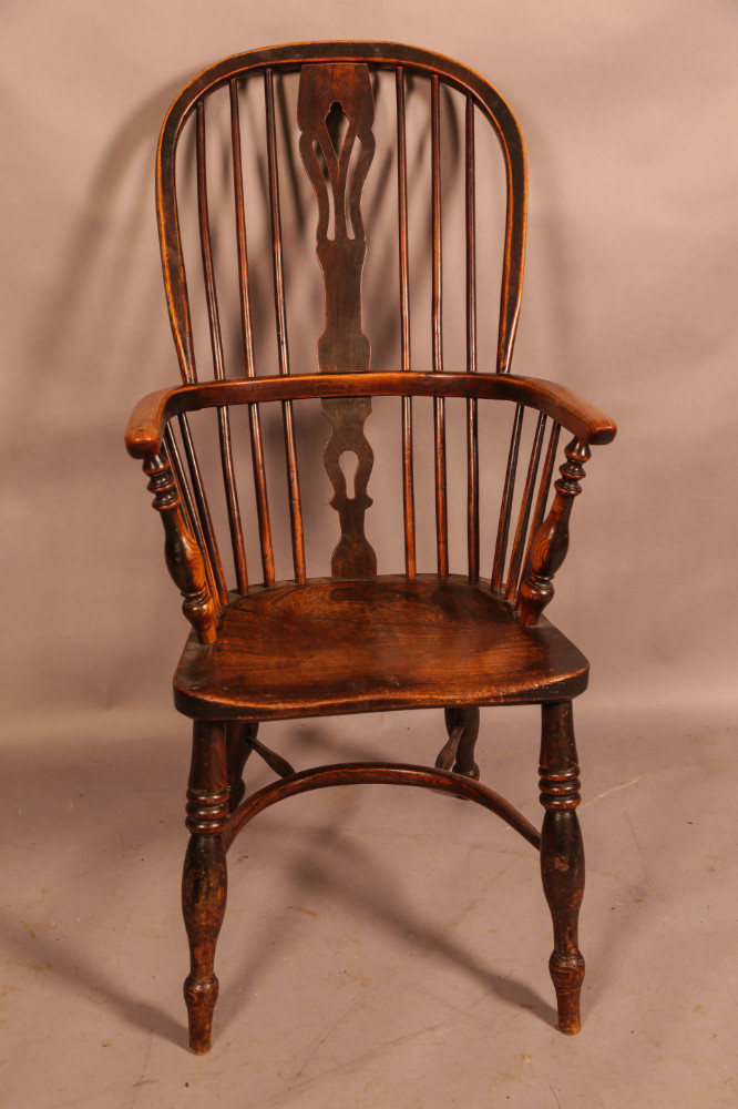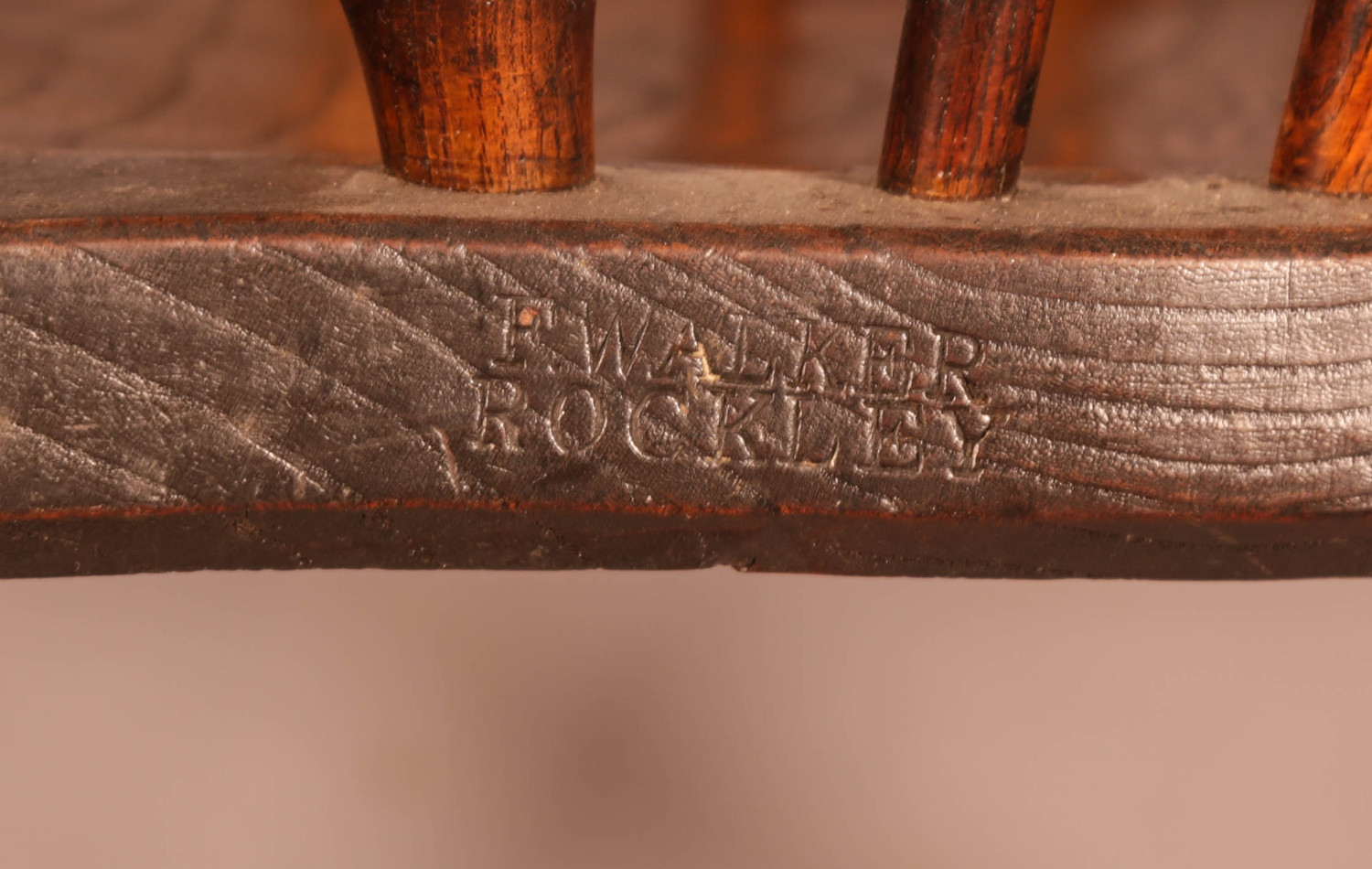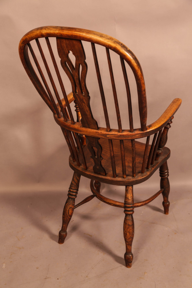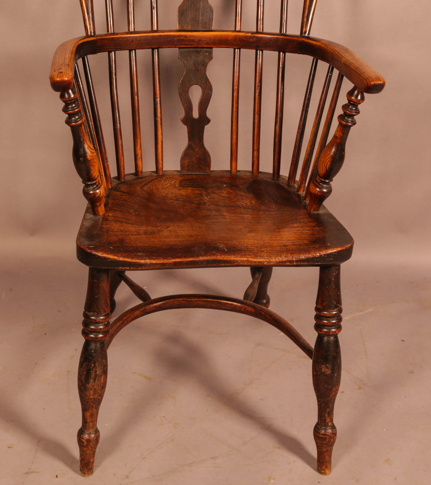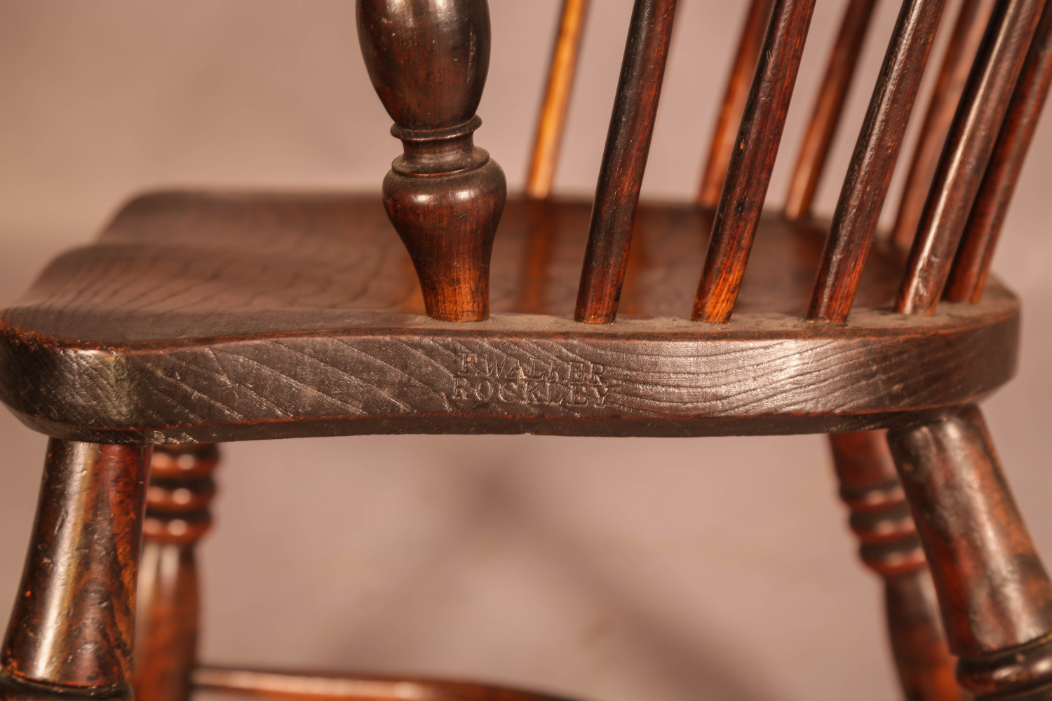 A Lovely Ash and Elm High Back Windsor chair by Fred Walker, it has the crinoline stretcher, Fred was making Windsor chairs from a Workshop in the tiny hamlet of Rockey just south of Retford in Nottinghamshire for almost 50 years. this chair is in excellent condition it has a wonderful colour and patina absolutley untouched, the seat is stamped on the right hand side.