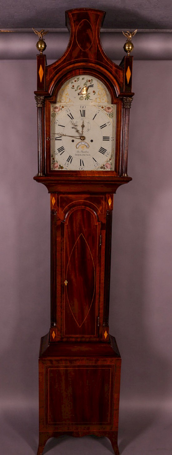 A Superb Georgian Longcase Clock by John Hunter of Bridlington the movement is 8 day duration and strikes the hour on a bell it has a date aperture and a seconds dial, all in working order. The case is figured Mahogany with inlay of Satinwood and is in exceptional condition.