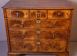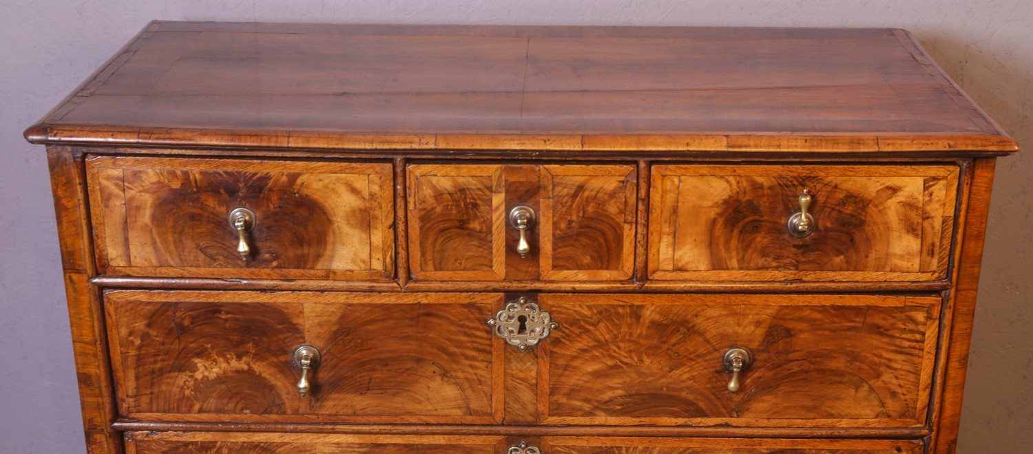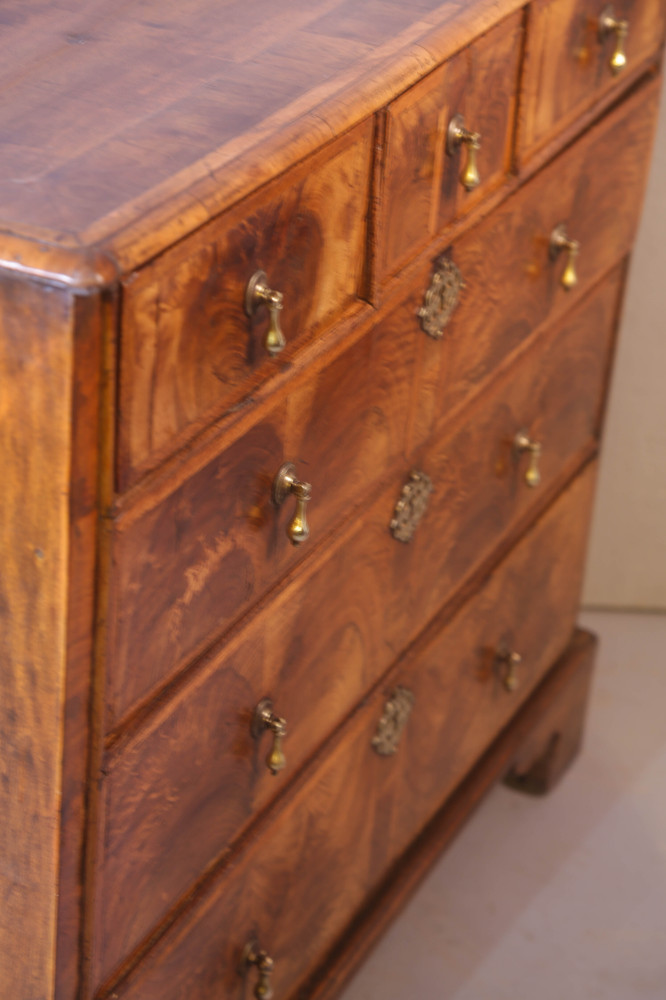 A George I Chest of Drawers it has three top drawers and three lower drawers, the brass drop handles are old replacements but the key escutcheons are original. the veneers are book matched and each drawer front has edge banding of Walnut, the top has a wide banding of Walnut. the condition is excellent and it has a very pleasing colour and patina