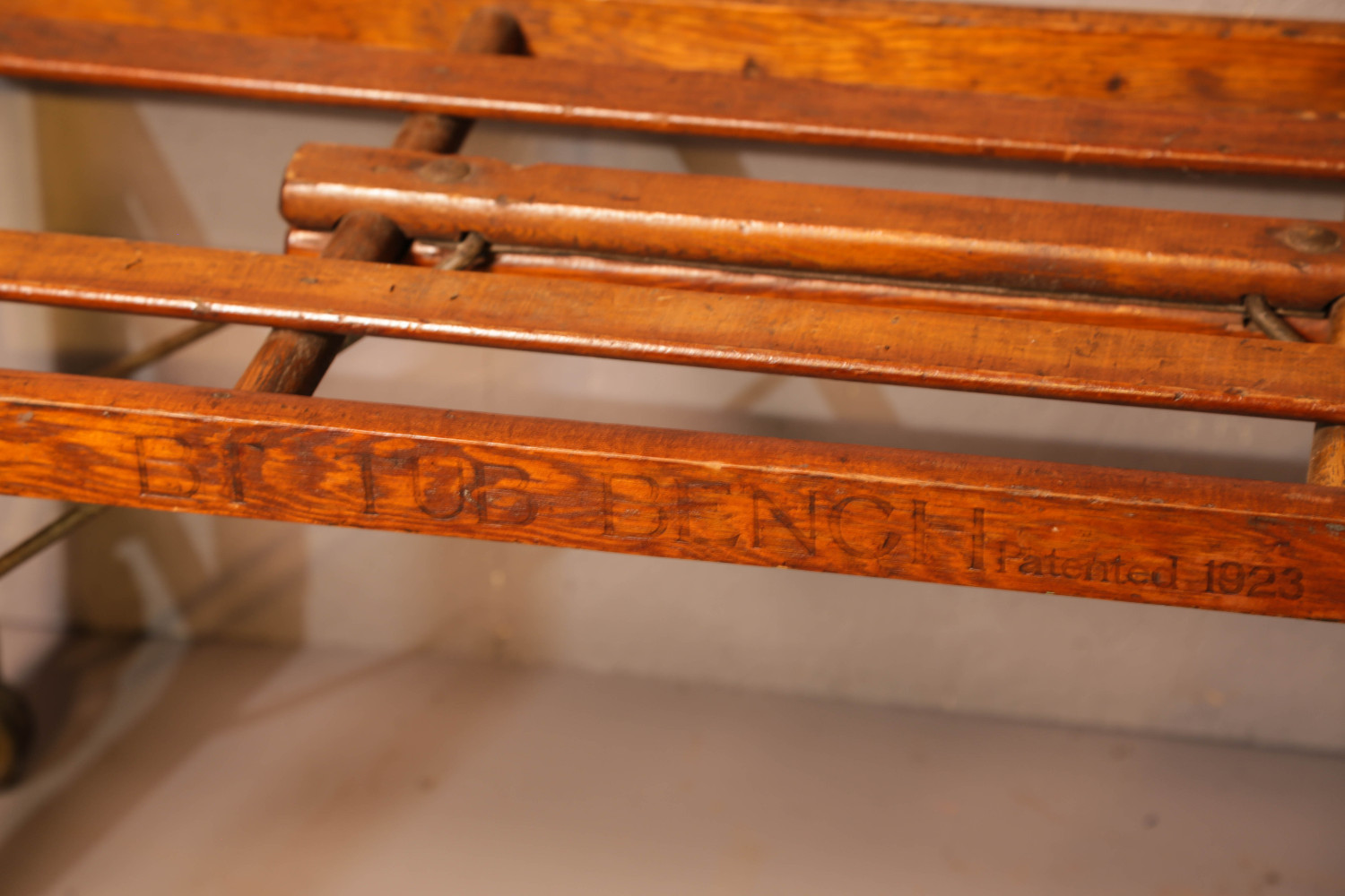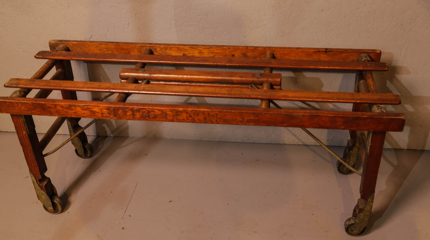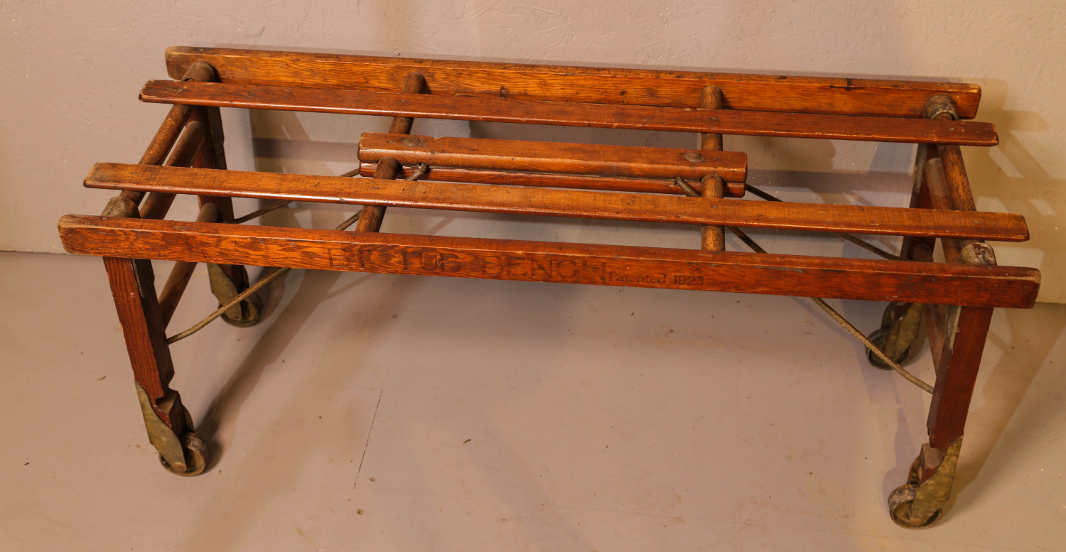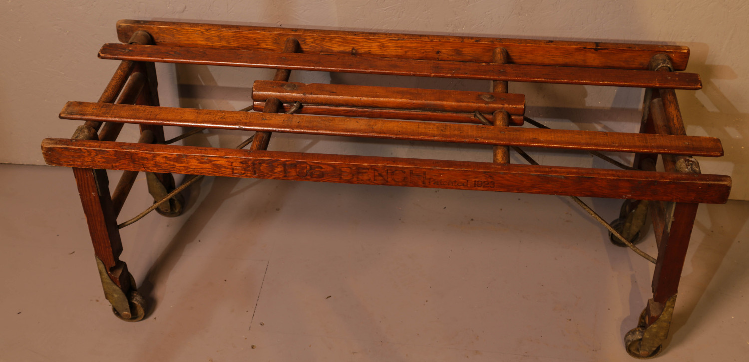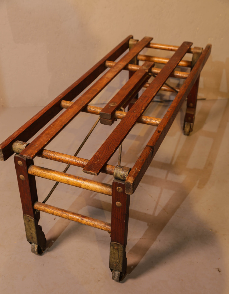 An Iteresting Lugage Stand made by Beatty Brothers of Fergus canada, the legs can be brought inwards so it will lie flat when not in use, the metal fittings and castors are dull and need polishing, it is in excellent condition