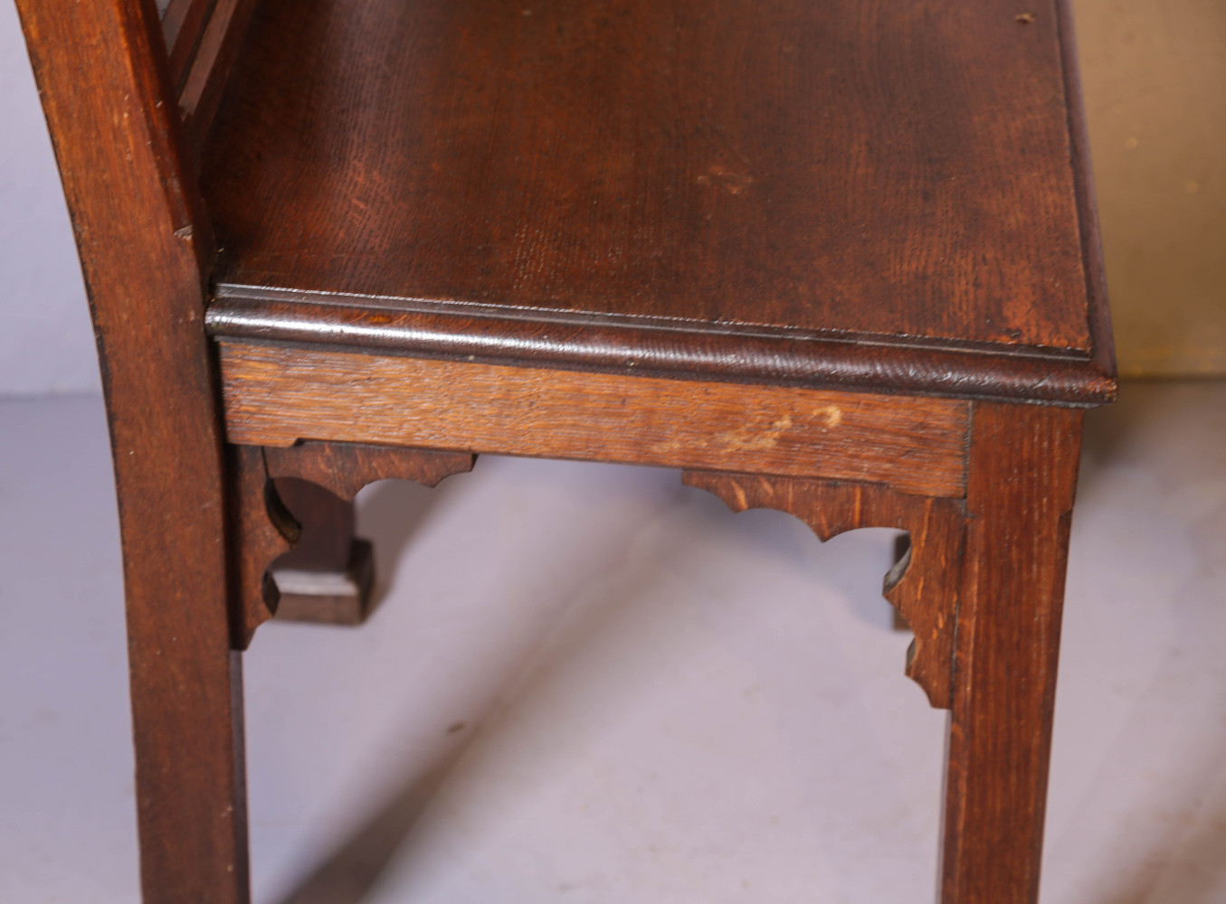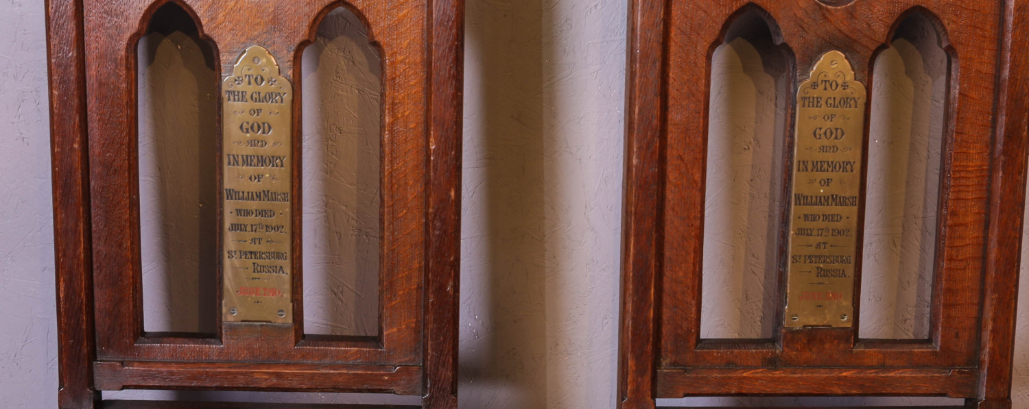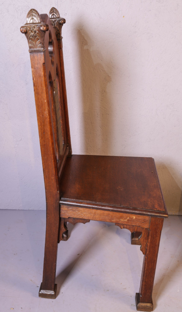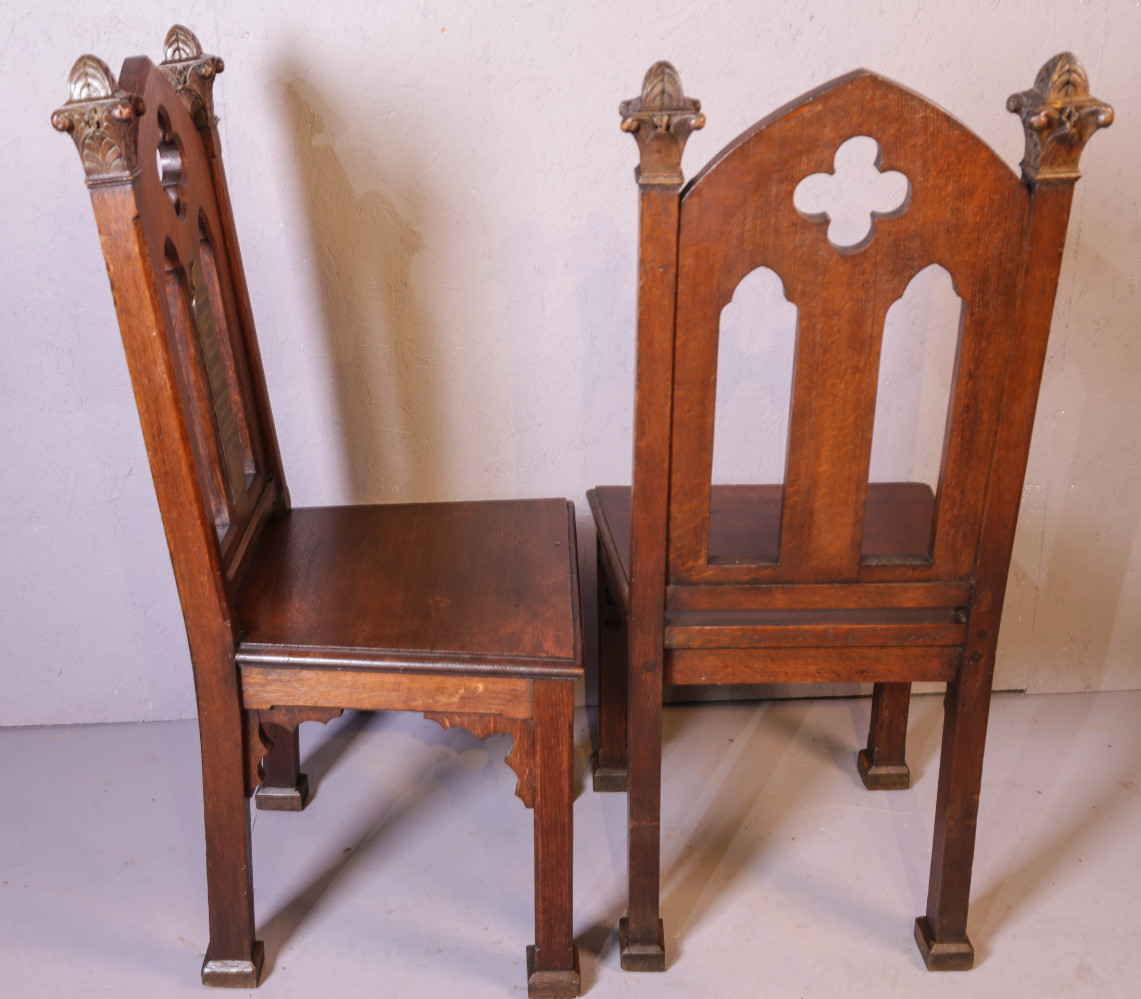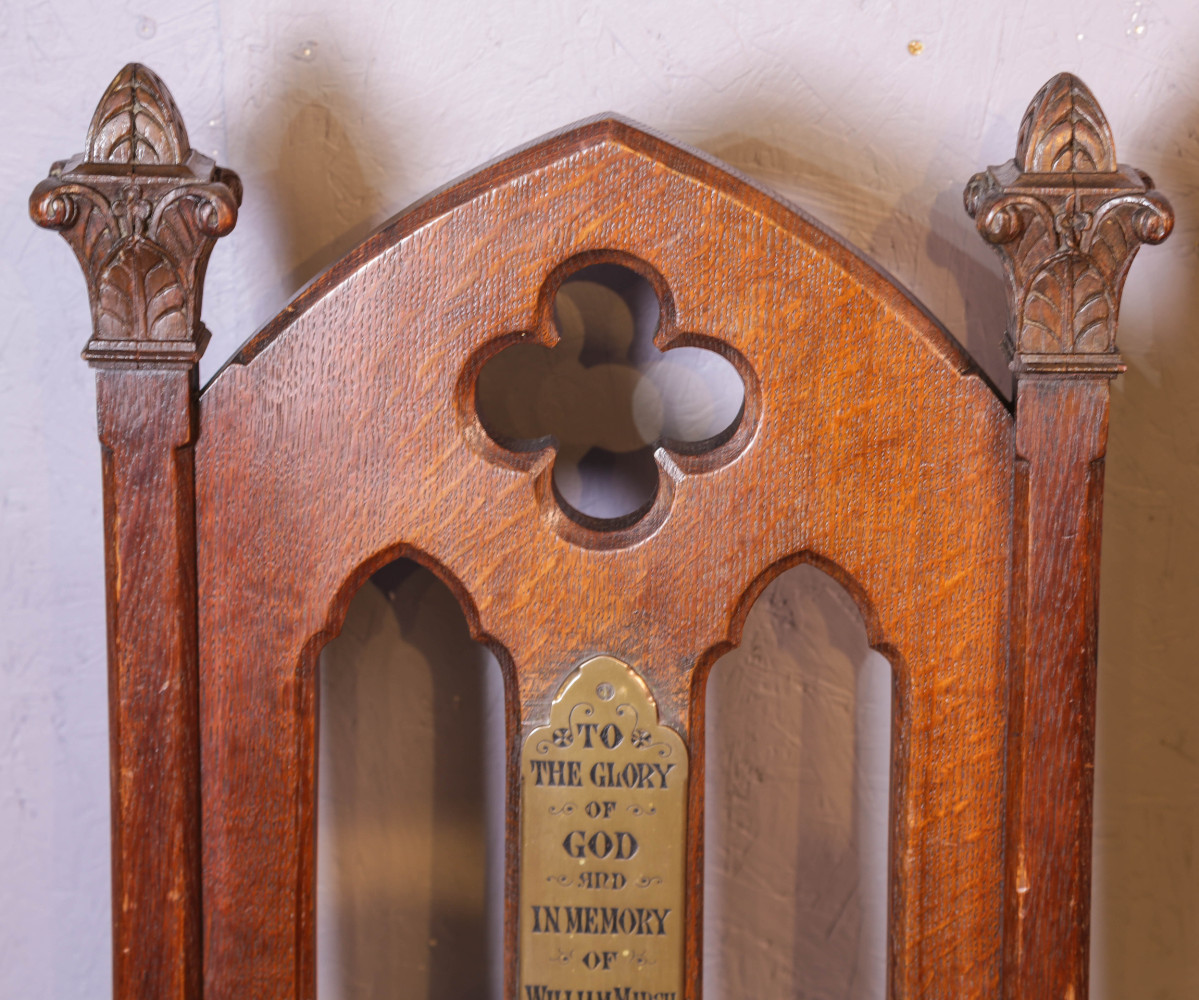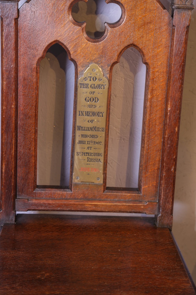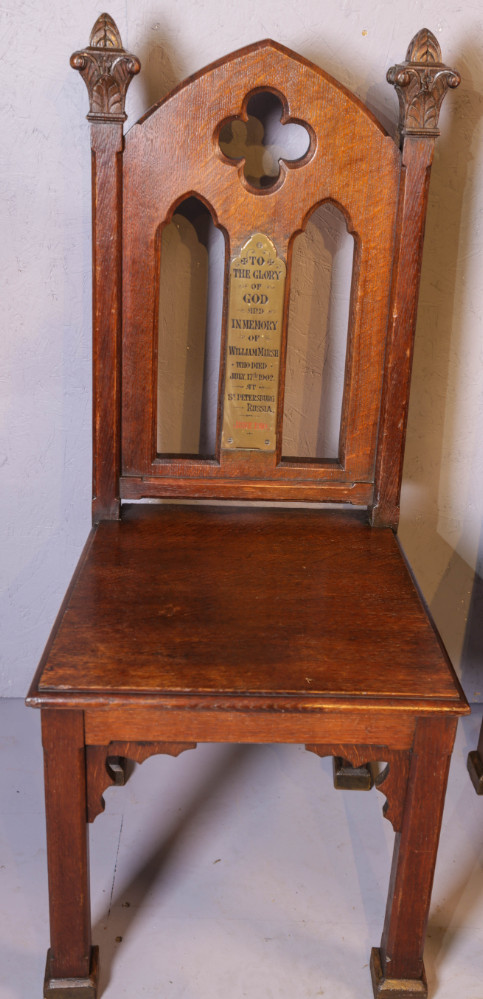 An Interesting pair of Gothic Church Chairs in Oak the each have an engraved brass plaque, in memory William Marsh who died in St Petersburg Russia 17th jULY 1902 they are in excellent condition and are very strong and sturdy