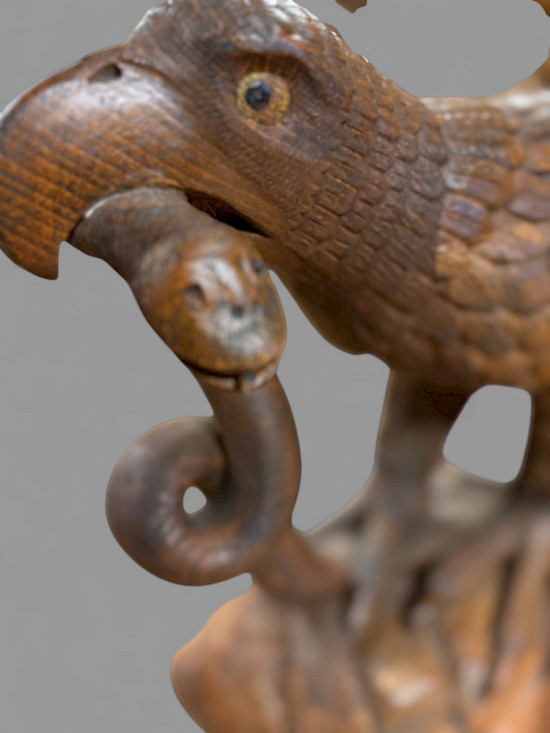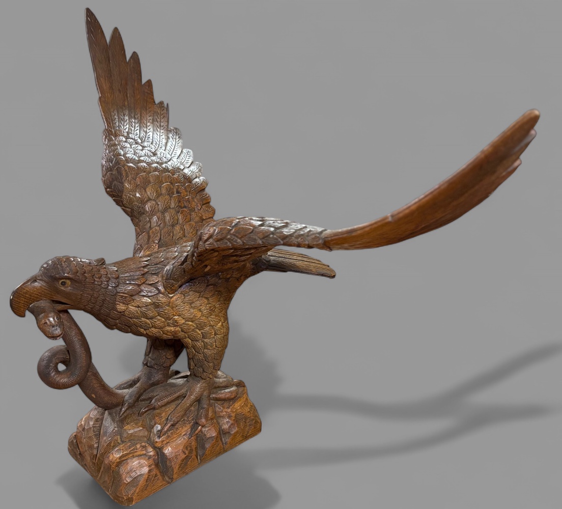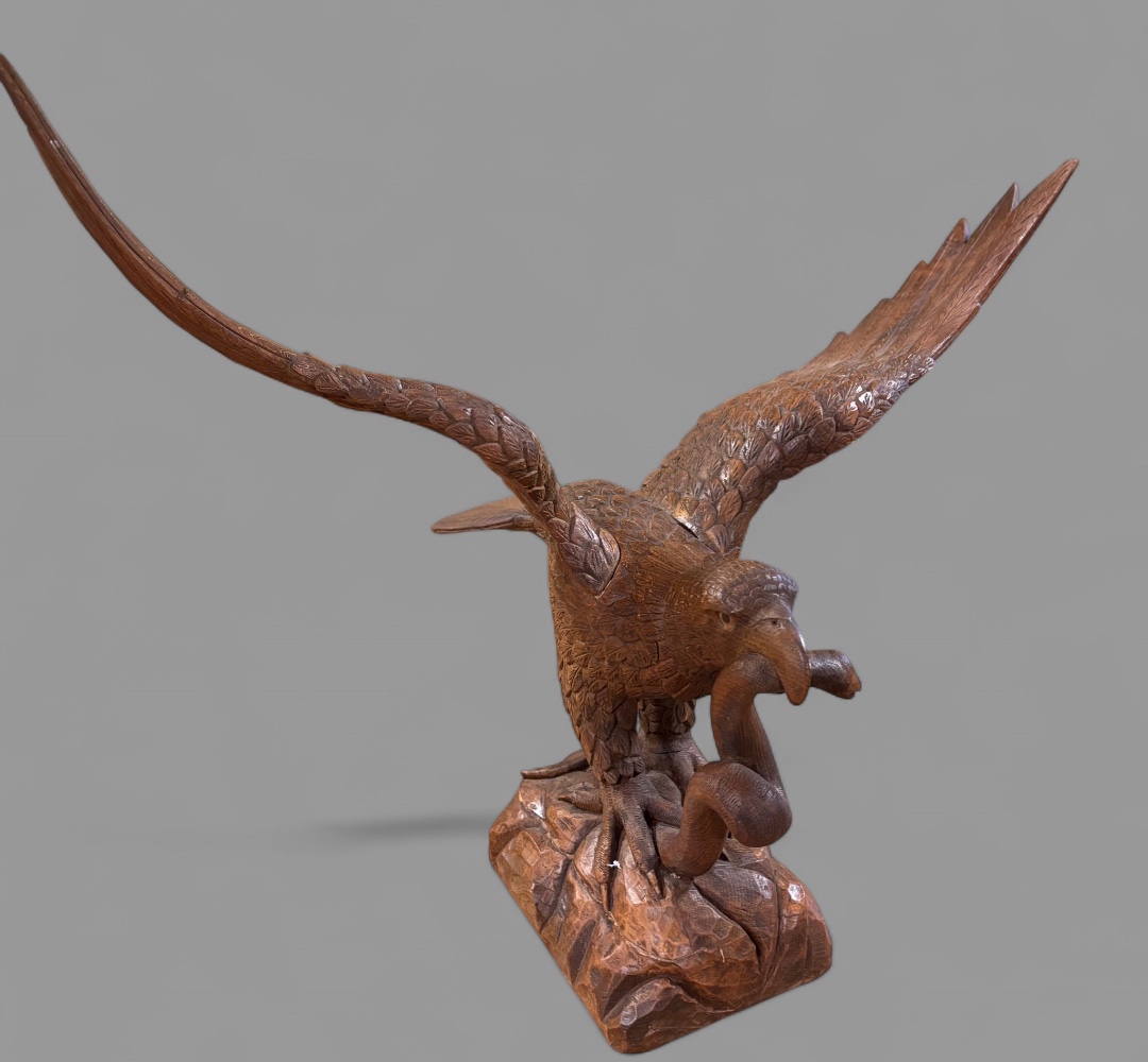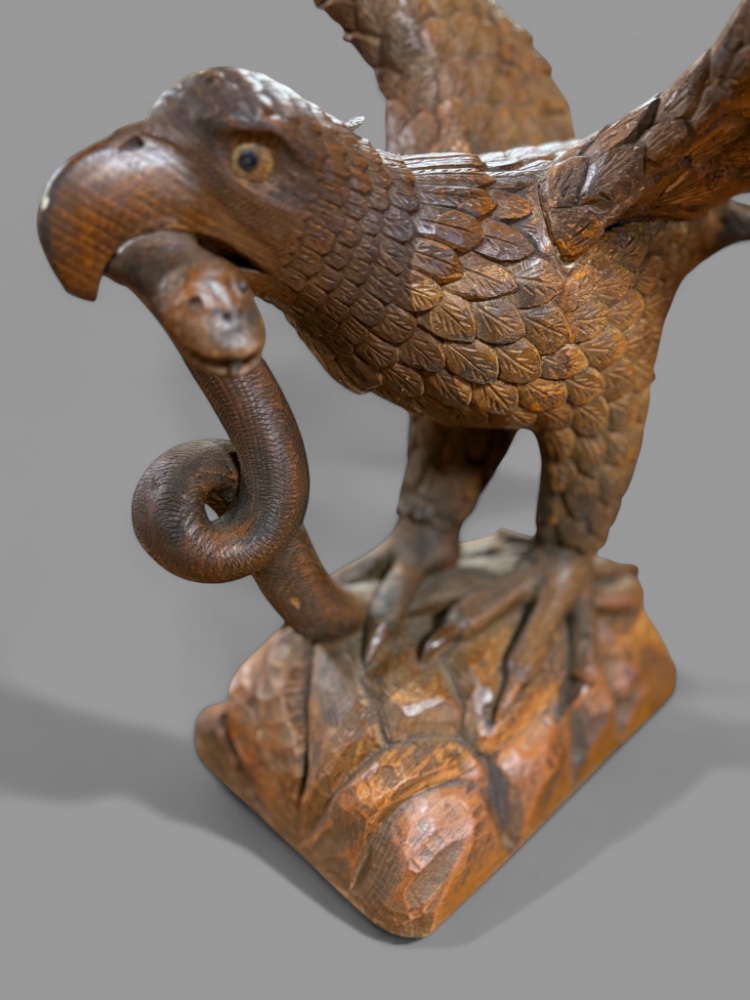 A superb carved lime wood eagle its wings outstretched as if just landing or about to fly it stands on a base and has a snake in its beak. The condition is excellent an impressive piece.