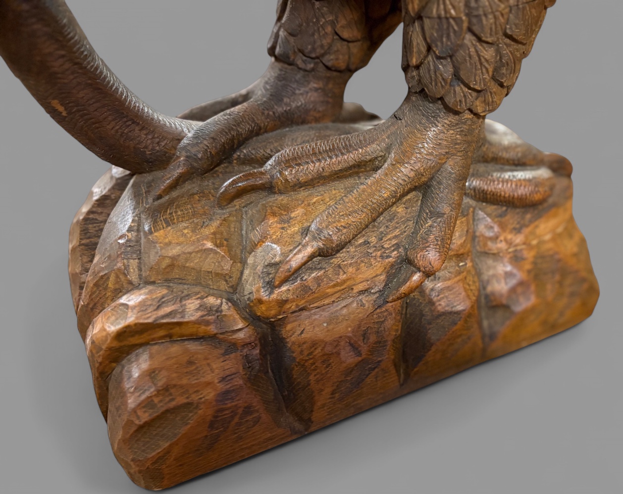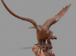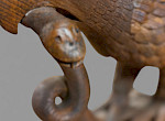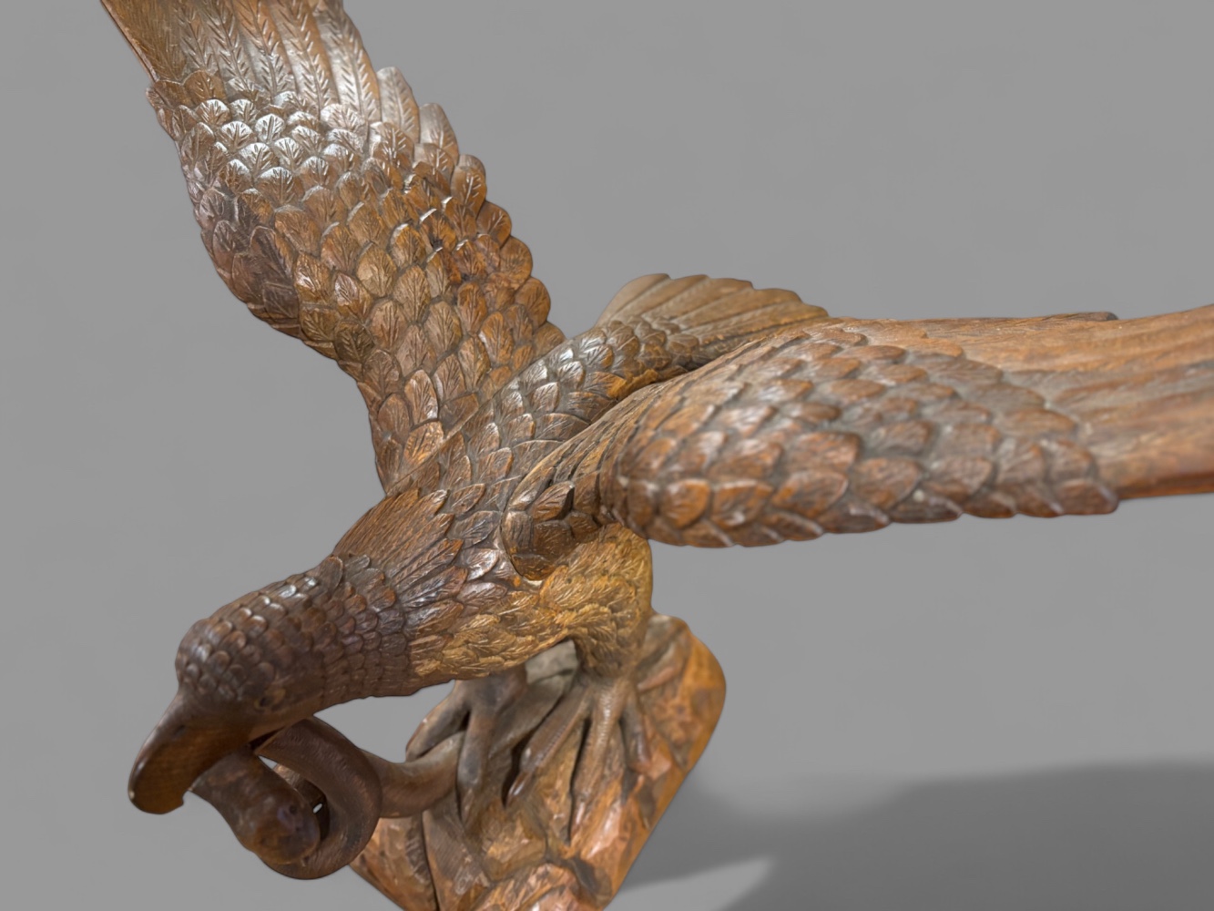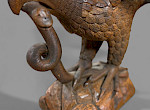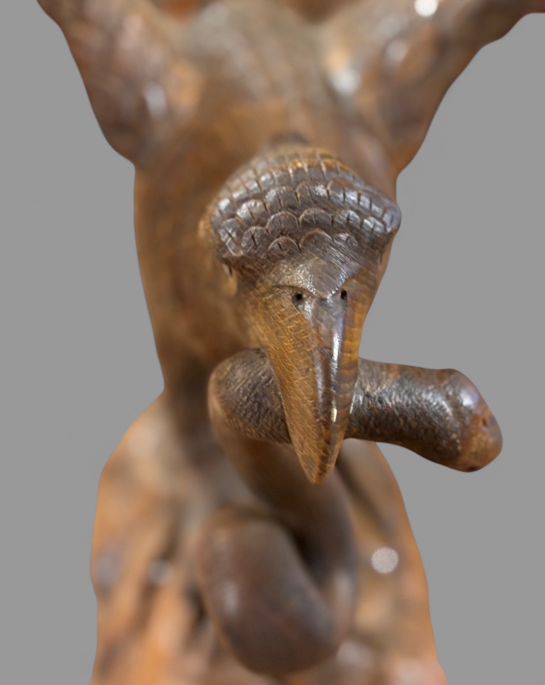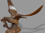 A superb carved lime wood eagle its wings outstretched as if just landing or about to fly it stands on a base and has a snake in its beak. The condition is excellent an impressive piece.