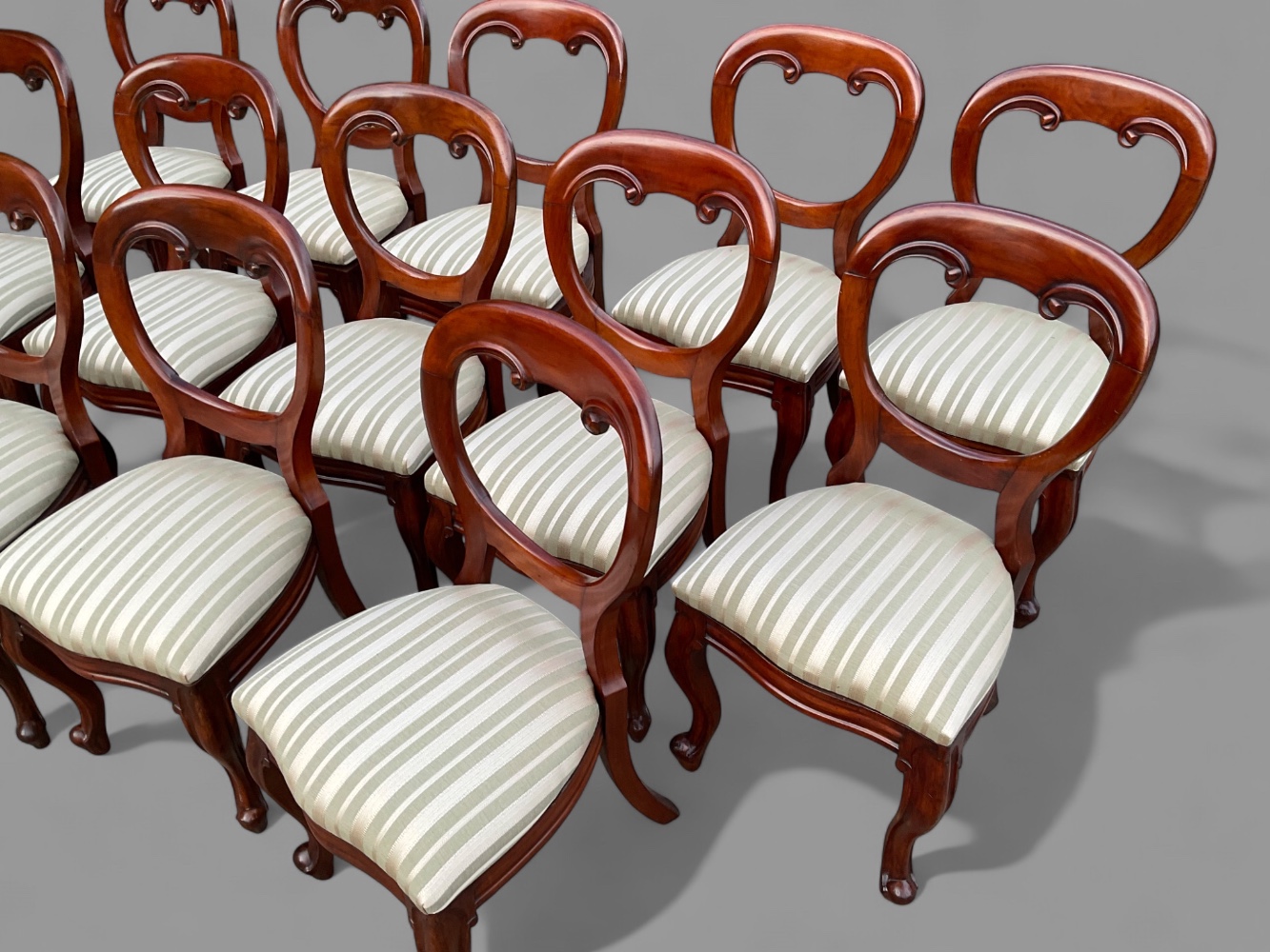 A matching set of 14 Victorian mahogany dining chairs, these quality dining chairs have just been fully restored and french polished by ourselves, the drop in seats have also been reupholstered in a quality pale green stripe fabric, the condition is excellent they are ready to go