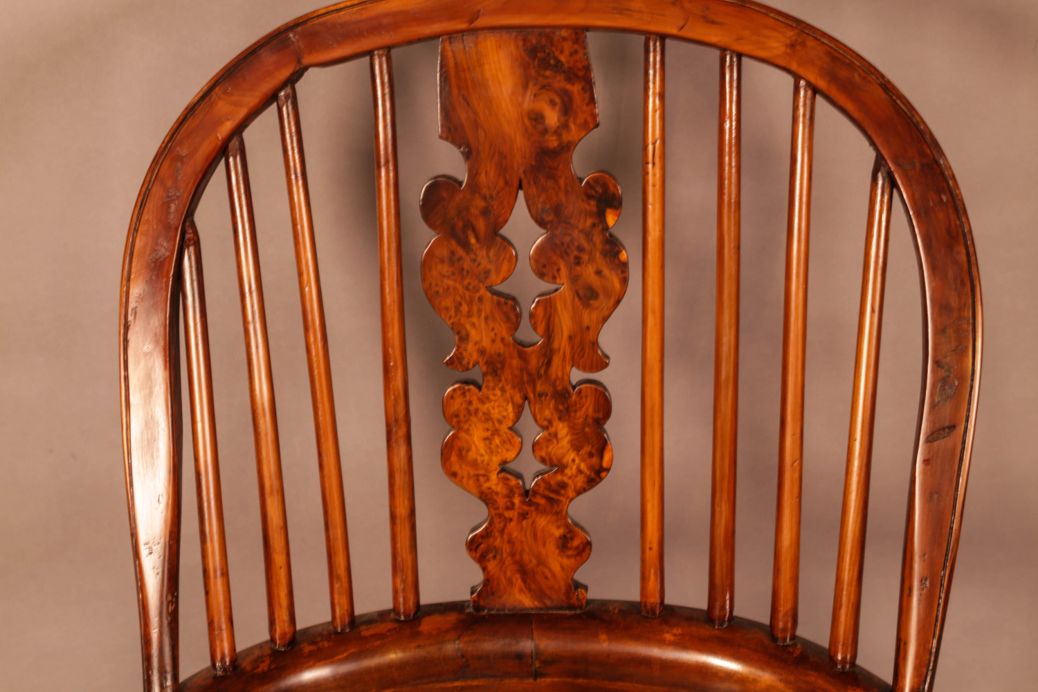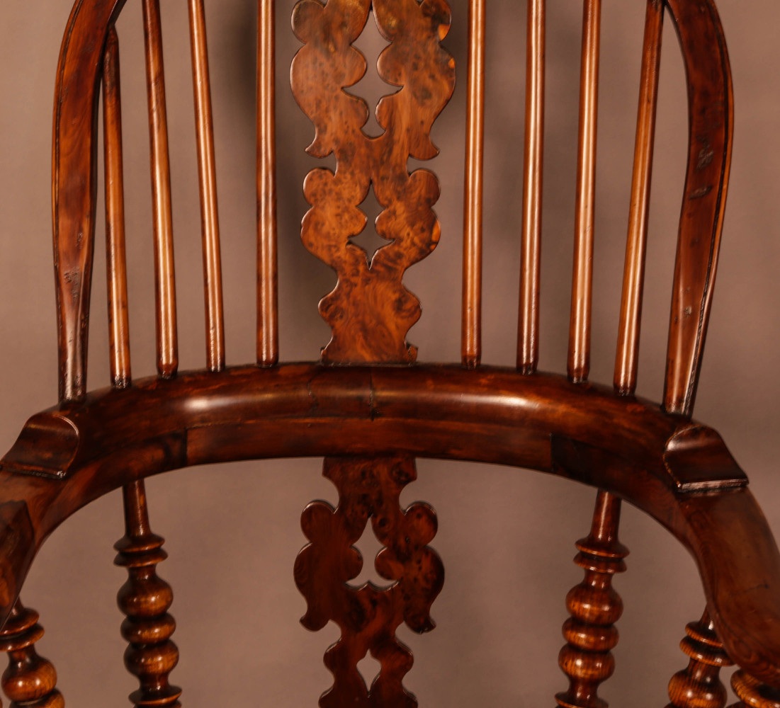 A Super Broad Arm Windsor chair in Yew Wood with an Elm seat a Worksop made chair probably from the workshop of Isaac Allsop, this chair is notable having very well turned legs and a back splat with remarkable Yew Burrs, it also hase a pleasing colour and patina, the condition is excellent.