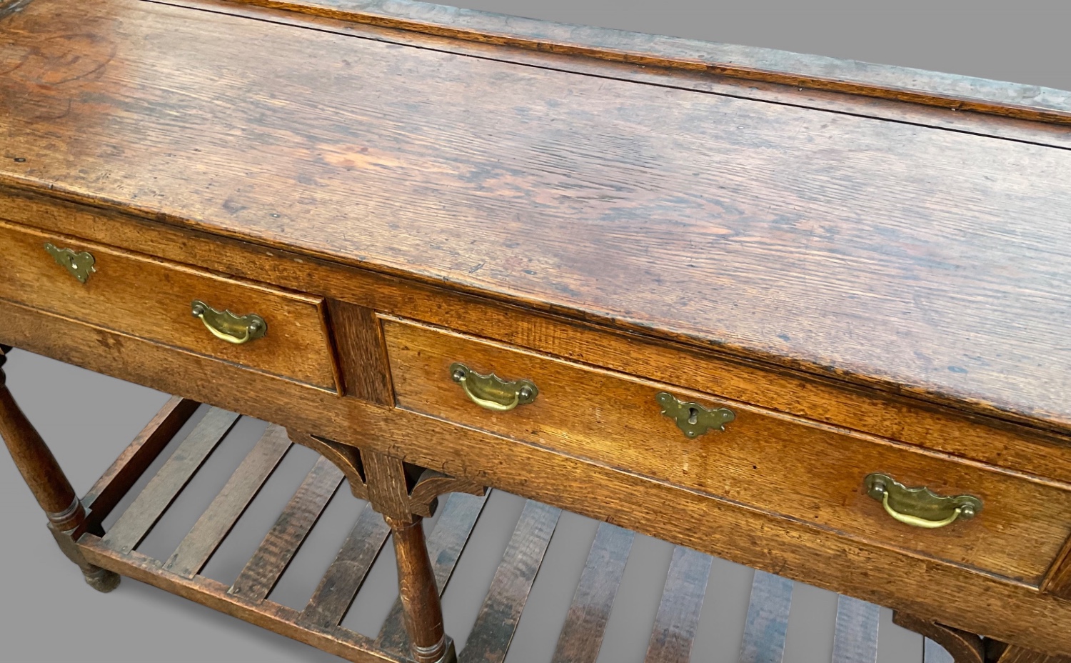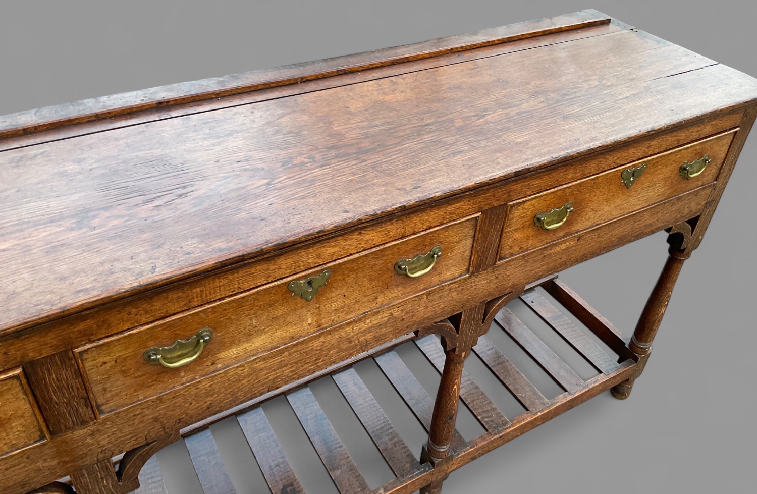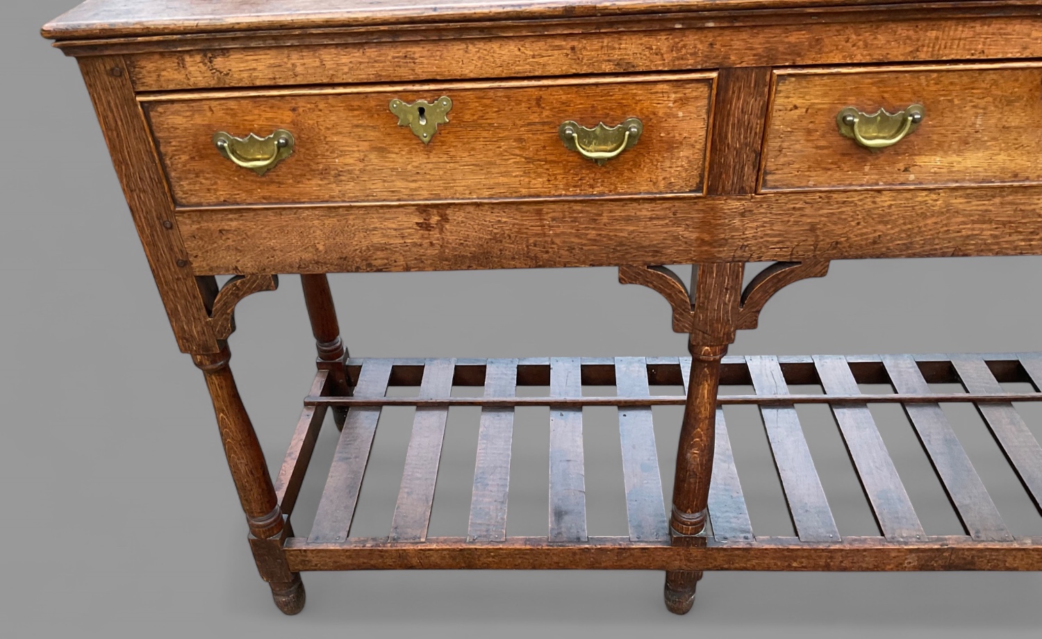 A lovely 18th century serving dresser in oak,it has three drawers with original brass handles, an open pot board underneath the drawers this has slats which is ideal to store pots and pans it still has its corner brackets, is in excellent condition with a nice colour and patina ,only ever been waxed, a super dresser