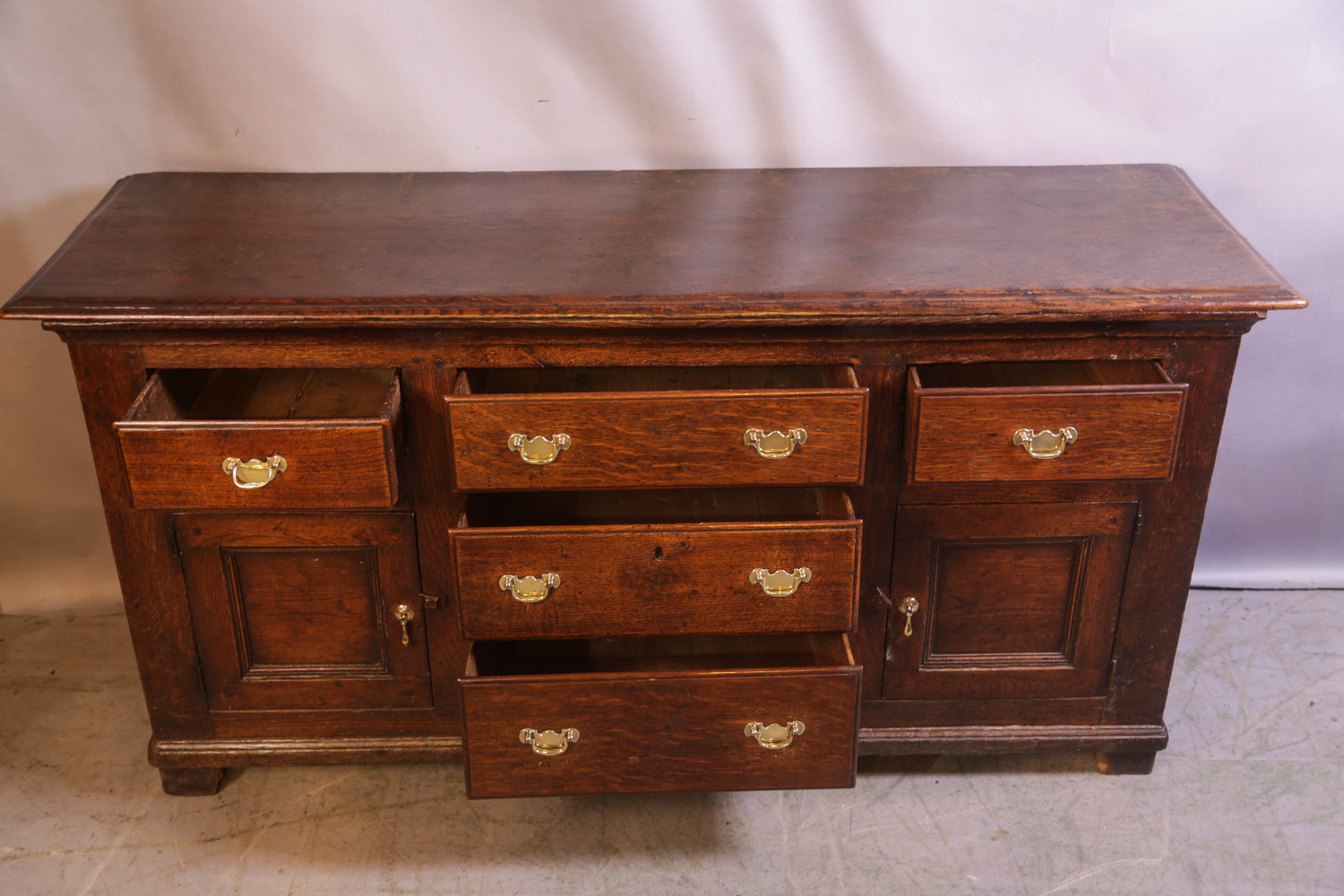 A Lovely very original Georgian serving dresser in Oak, it has five drawers and two cupboards . the condition is excellent ,it has a very pleasing colour and Patina it has never been stripped or over cleaned,