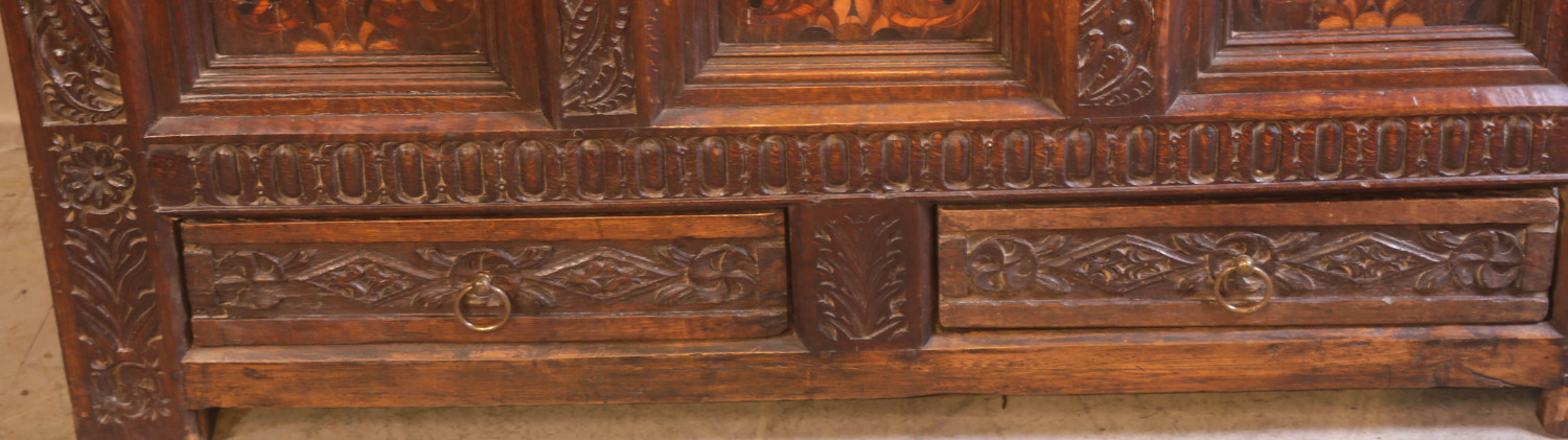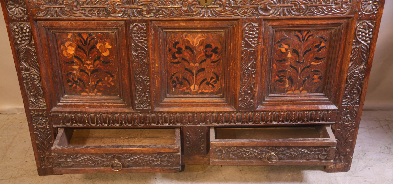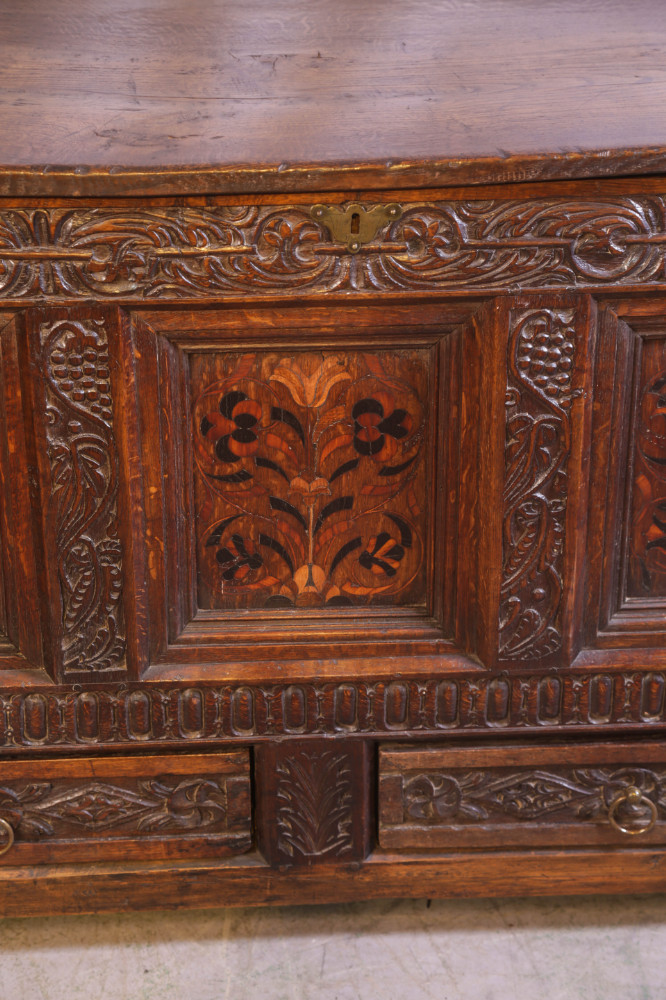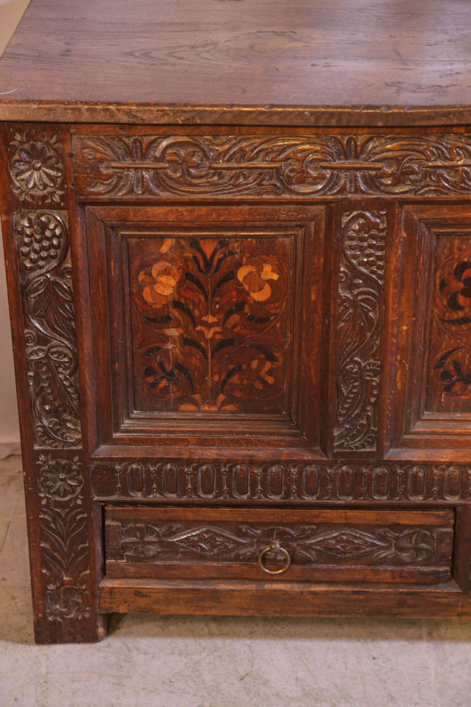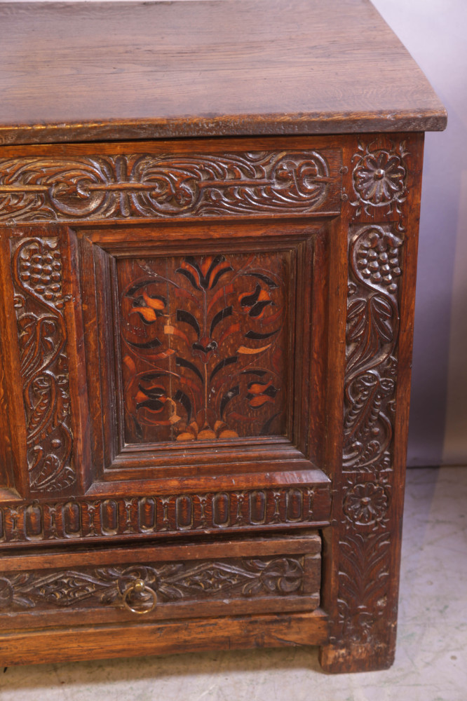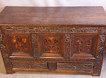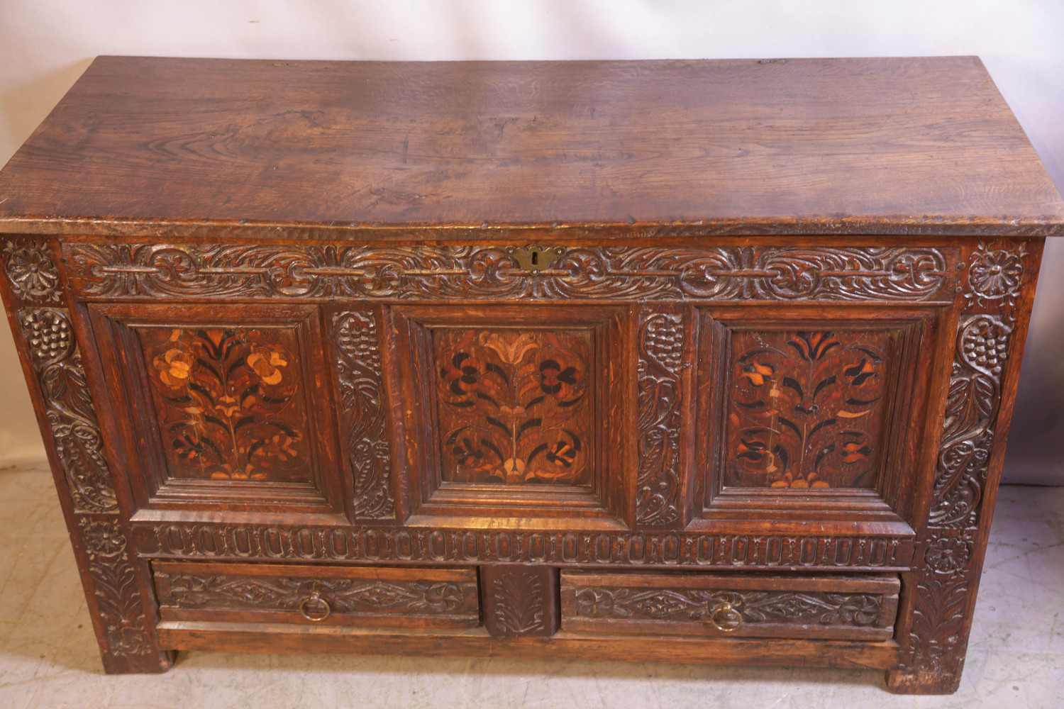 A Rare large Blanket box or coffer in Oak it has two drawers at the front, the three panels are inlaid with Bog Oak and Holly, and are stylised flowers or plants,the carving is also original and very detailed. it is from the west yorkshire area, i bought it in Leeds and it was said to have belonged in that family for centuries. the condition is excellent