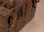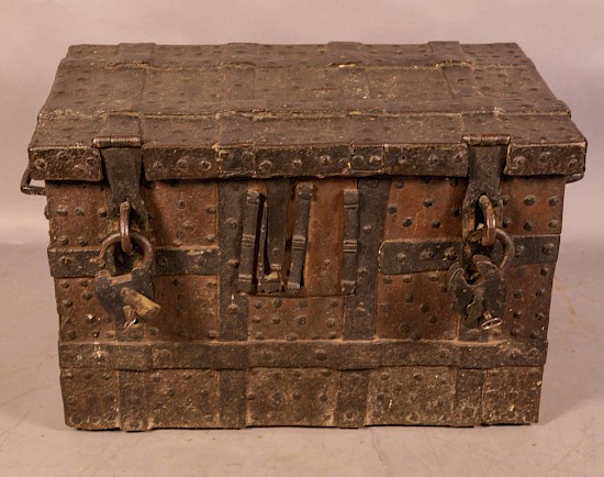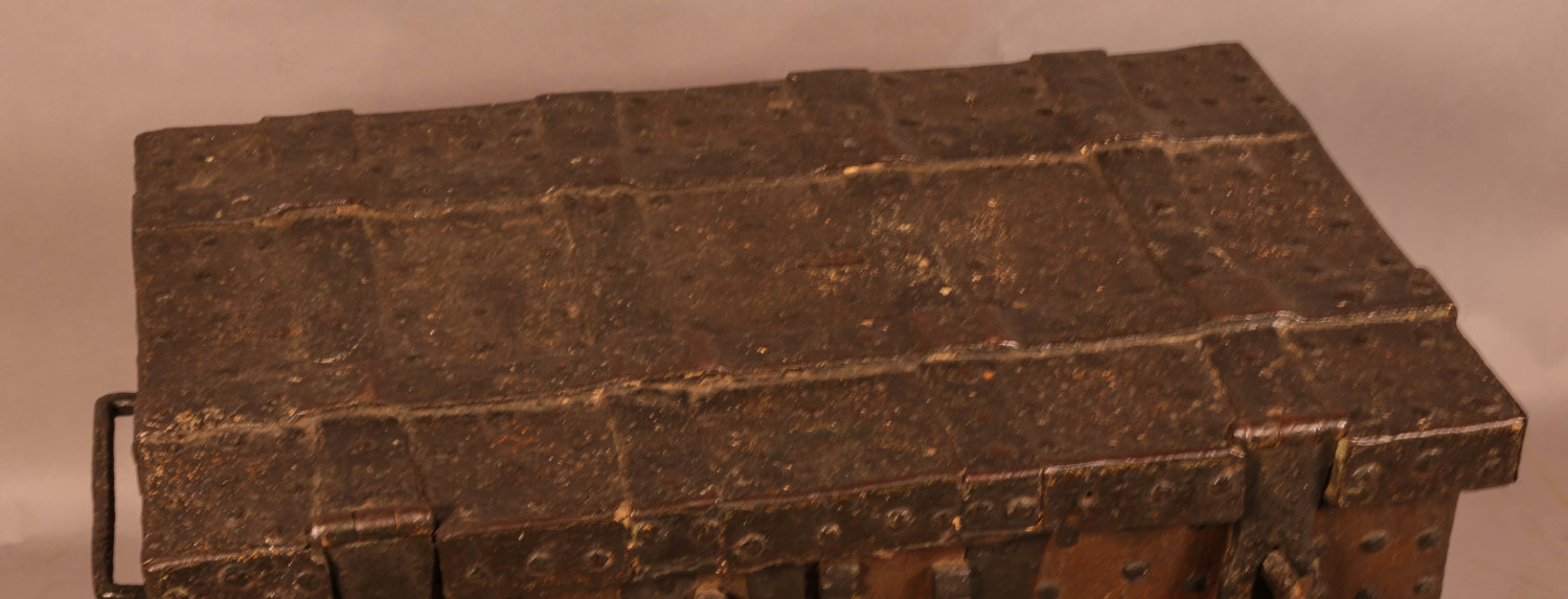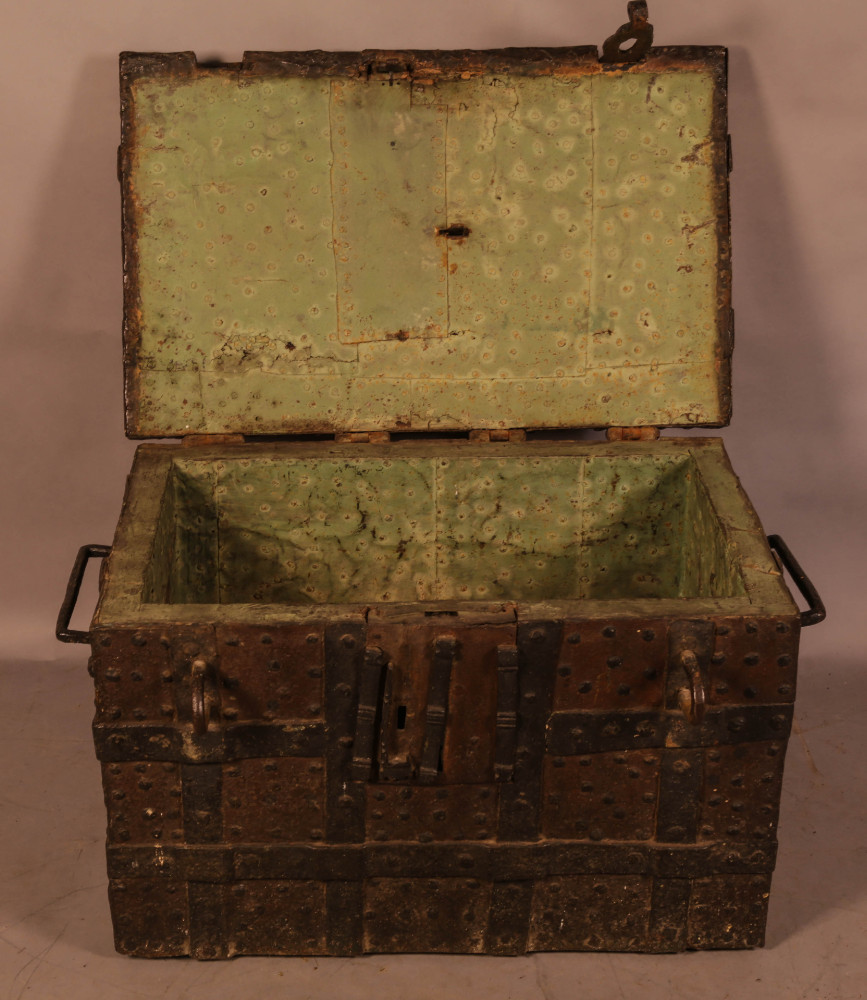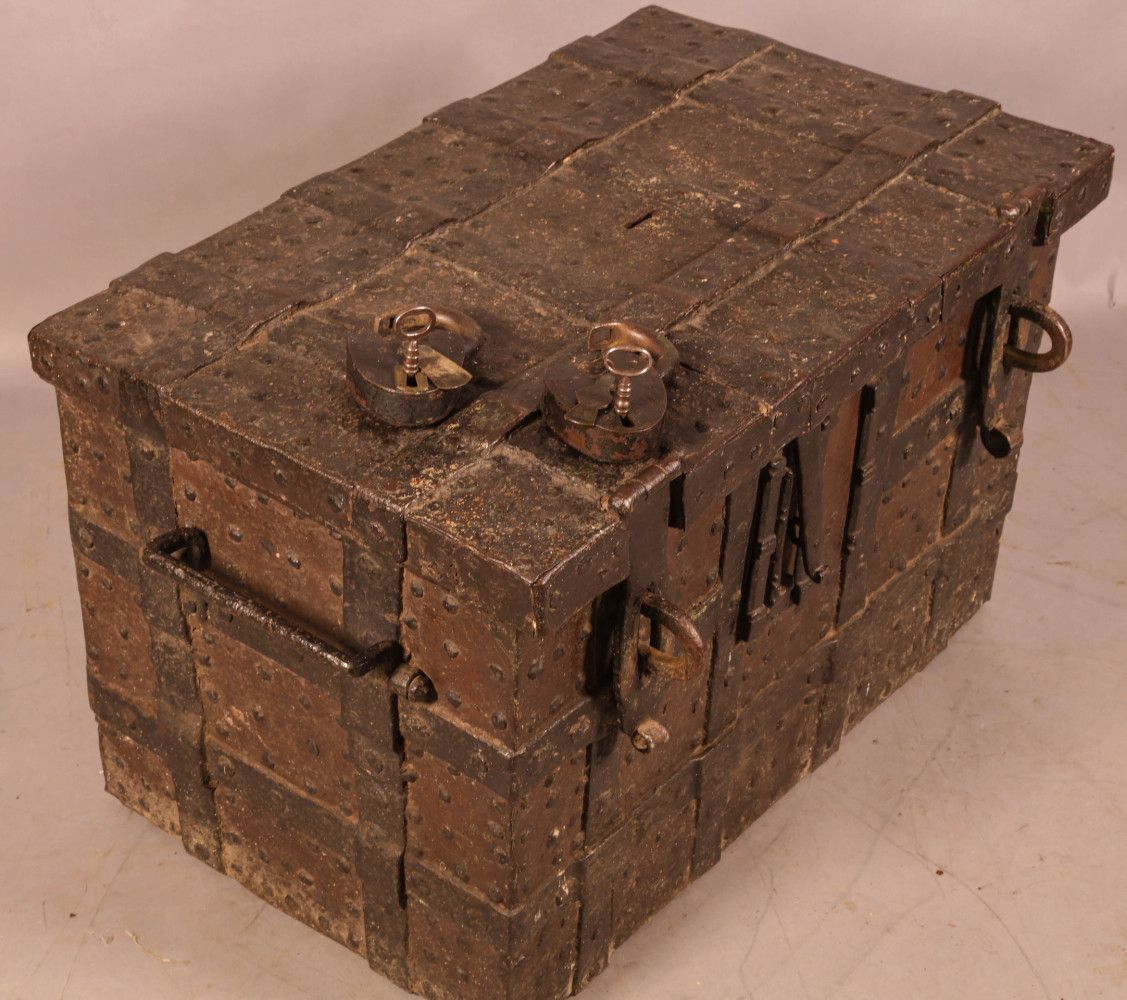 A Very rare 16th century Iron strong Box, probably from a church ,it has a slot in the top for collecting coins, also compleat with two locks with keys, The condition is excellent.