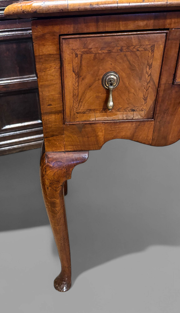 A Fine Early Georgian Low Boy in Walnut it has three drawers and stands on Cabriole legs the top is Quarted and Book Matched and crossbanded in Walnut and has herringbone inlay betwean these two. the condition is excellent