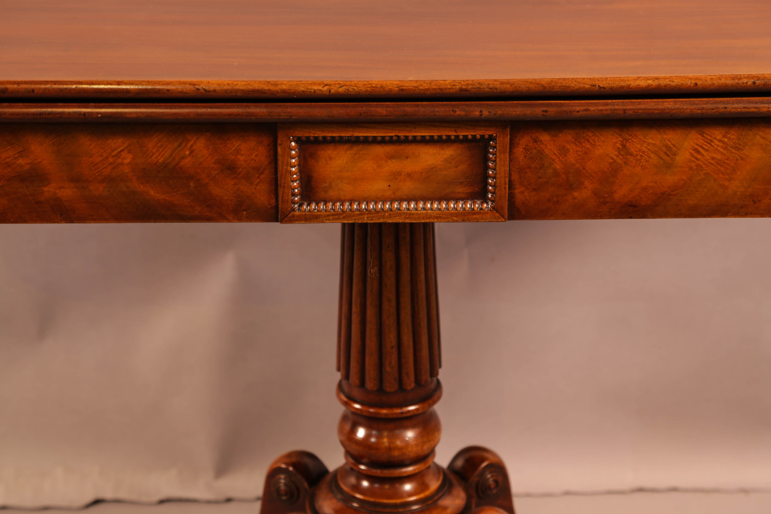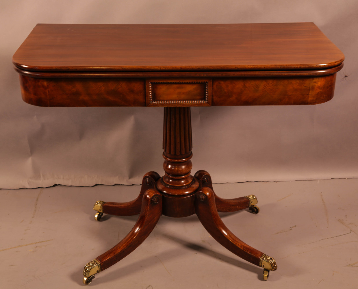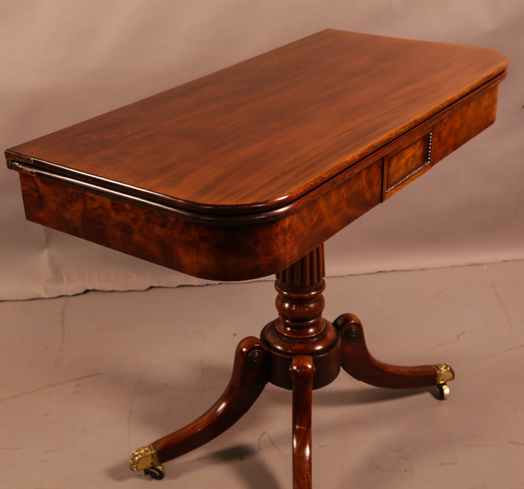 A Very Nice Georgian Games Table in Mahogany, the base has a reeded column above four splay legs which have turned circular Paterei to each knee these terminate with super cast cup castors, the top opens to reveal a baize lined playing surface. The condition is excellent.