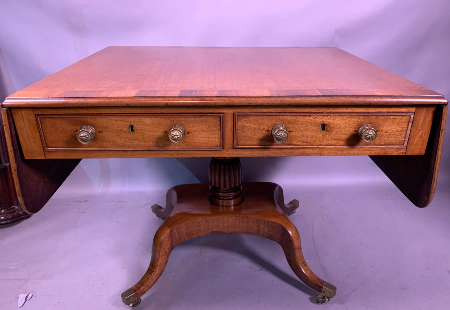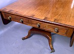 A Very Attractive Georgian Sofa Table in Mahogany the top is cross banded with Rosewood, it has two drawers to the front and two faux drawers to the rear, the side drop leaves are held in position by hinged wooden brackets. The condition is excellent with a nice faded colour