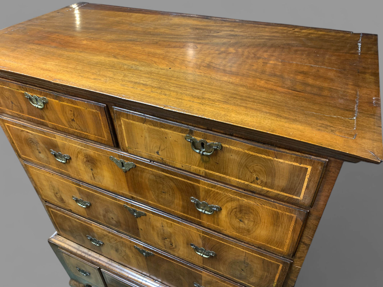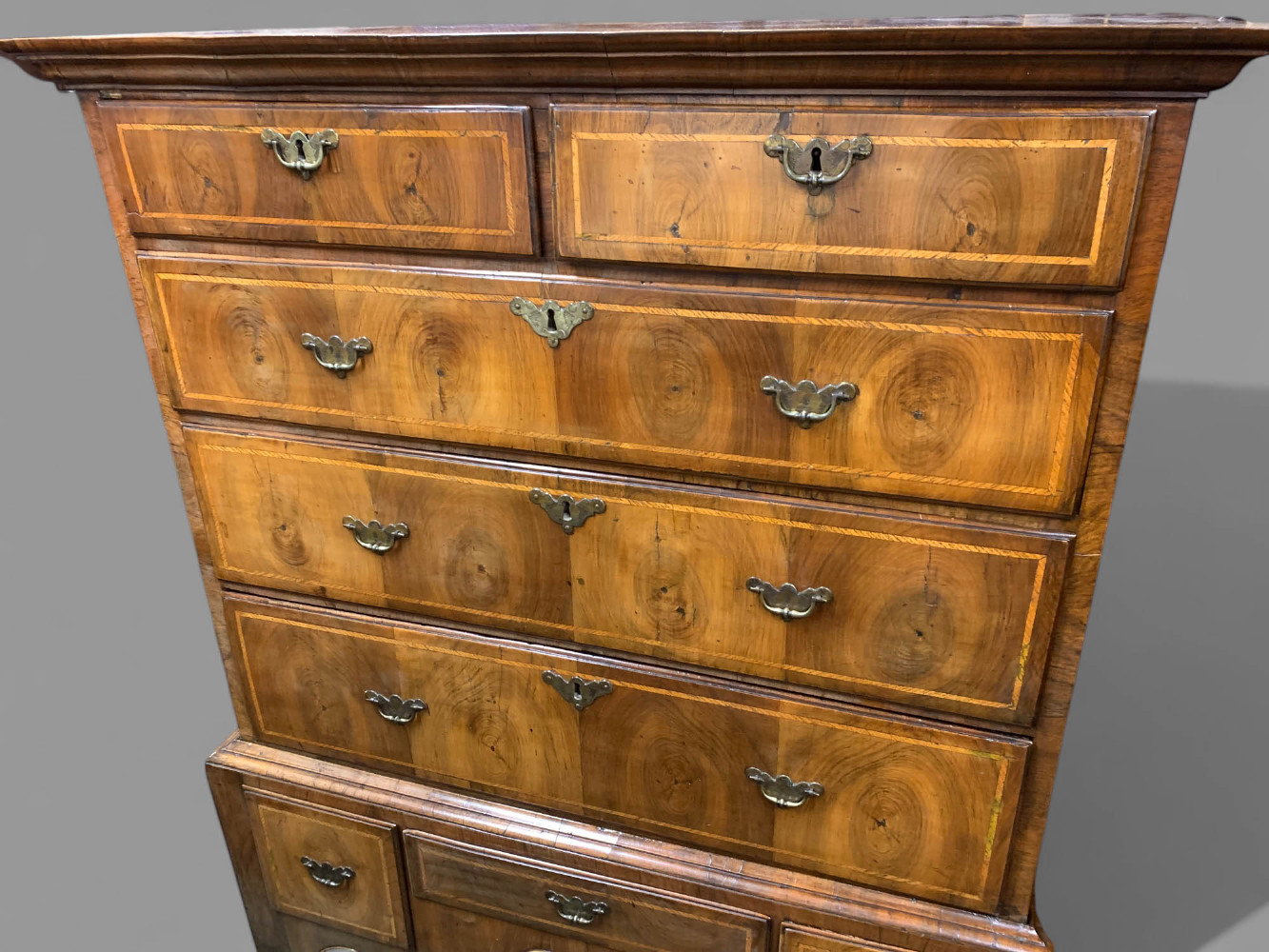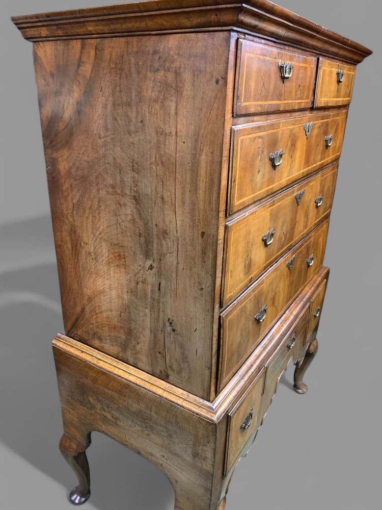 A Super George Ist Chest on Stand veneered in Oyster Walnut it has a band on inlay around each drawer front, it is in two parts top and bottom the bottom stands on original cabriole legs , the sides and top are also veneered with Walnut. This is a lovely early piece in Excellent condition with a pleasing colour and Patina