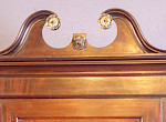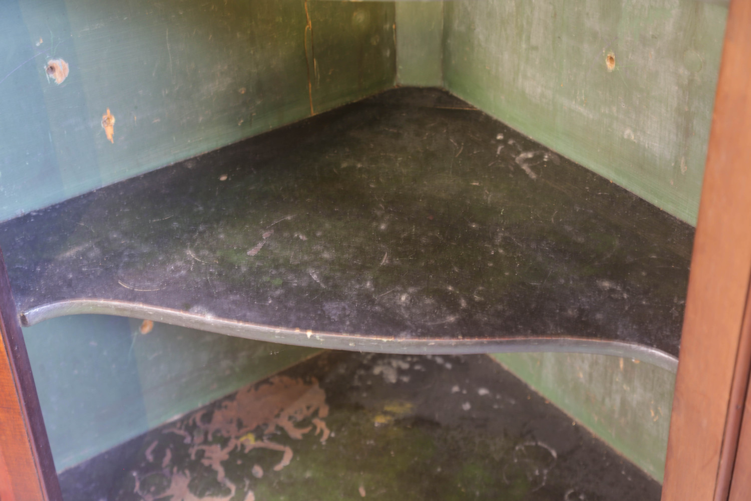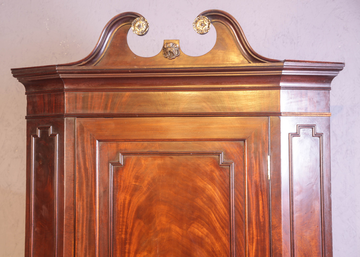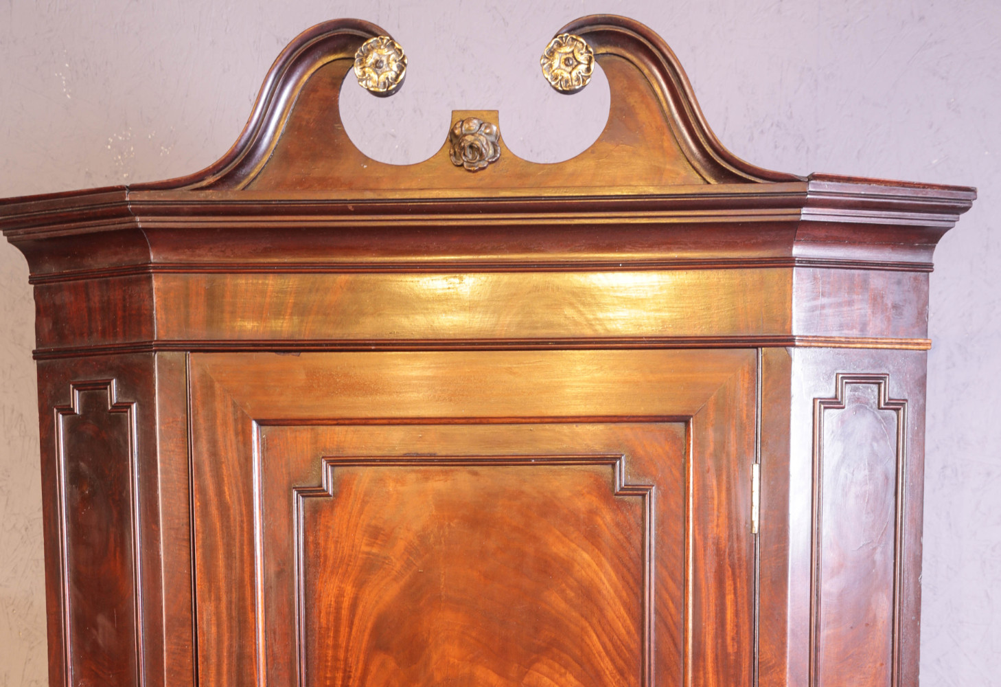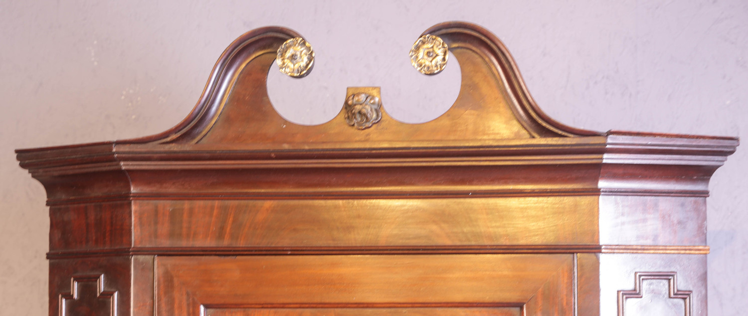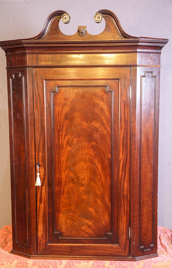 A Fine 18th century flat front corner Cupboard in Flame mahogany, it retains its swan neck pediment with applied brass decoration these are always missing , it has applied mouldings to the front and sides , the interior has shaped shelves and it still has its original green paint, what a cracker. the condition is excellent ,it has a key and working lock