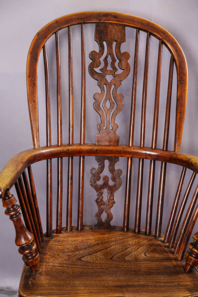 A very Rare High Back Windsor Chairin Yew wood with an Elm Seat Probably by John and Elizabeth Gabbitass a prominant Chair Maker of Worksop Nottinghamshire. This chair has all the hallmarks of the gabbitass tradition of highest quality Windsor CHairs in addition it has turned and shaped rear crinoline stretcher supports something i have never seen before. the leg turnings and splat piercings are the best. a super chair in Excellent condition, it has a very pleasing colour and patina and has only been waxed prior to selling