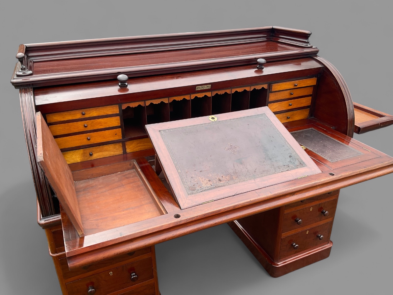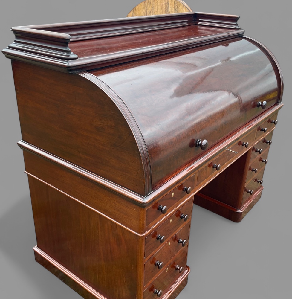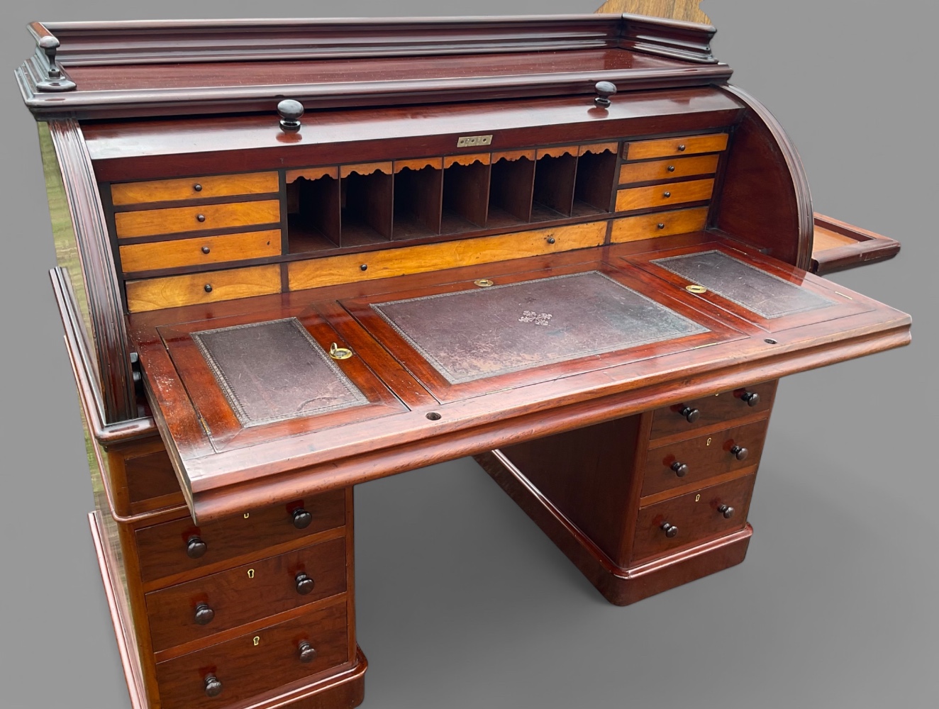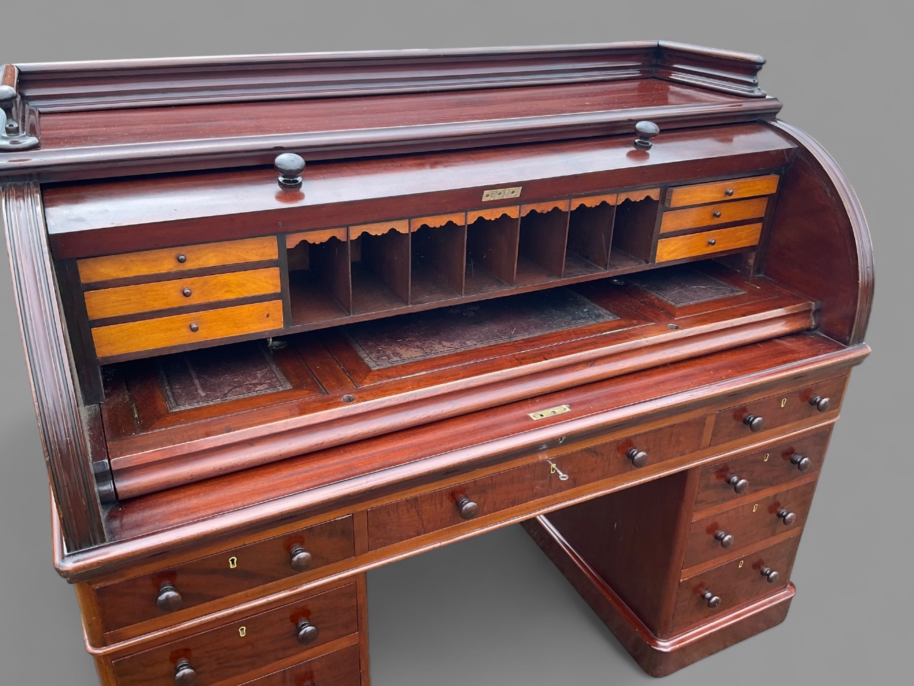 A stunning extra large Victorian cylinder desk in mahogany , the base has four drawers down either side and a single one in the middle, the upper cylinder section has the fall front in the shape of a cylinder opening to reveal a bank of six drawers and seven small compartments for letters etc , the writing platform pulls forwards and the three sections with the leather surface can be opened the centre one has a ratchet arrangement that allows it to sit in several different positions, the slide has three drawers also . The condition is superb, it is in 4 sections for ease of handling