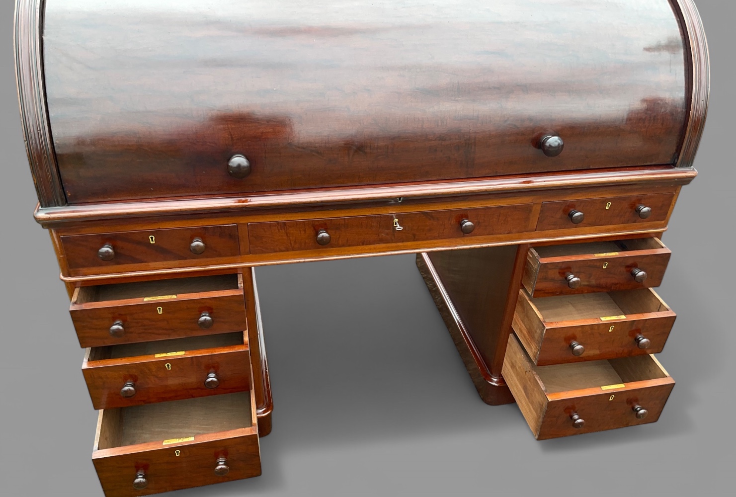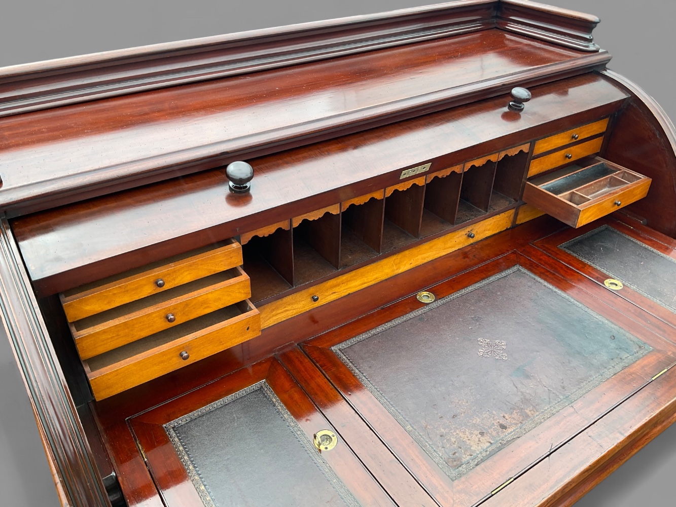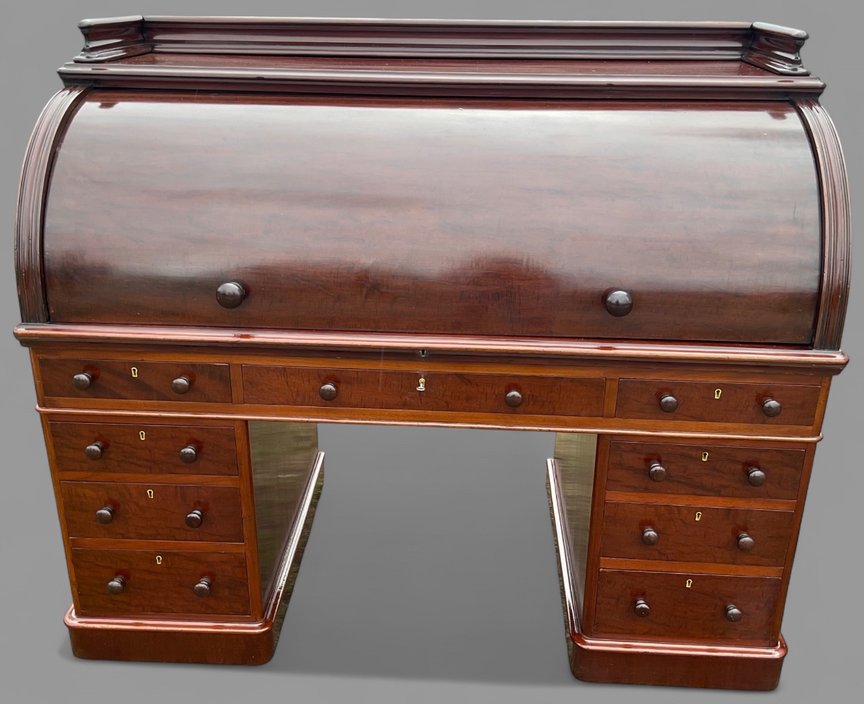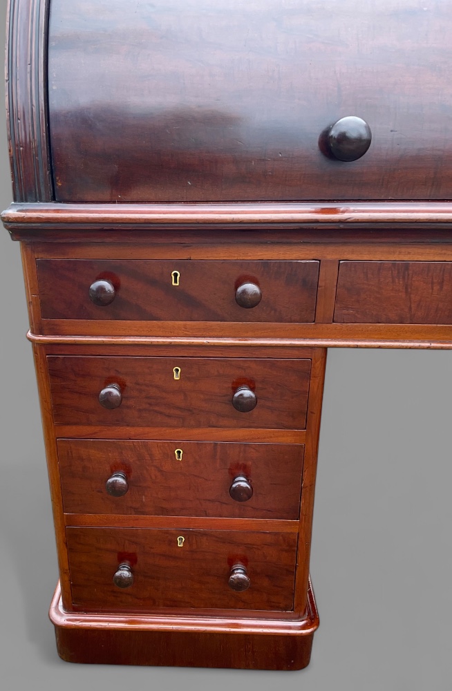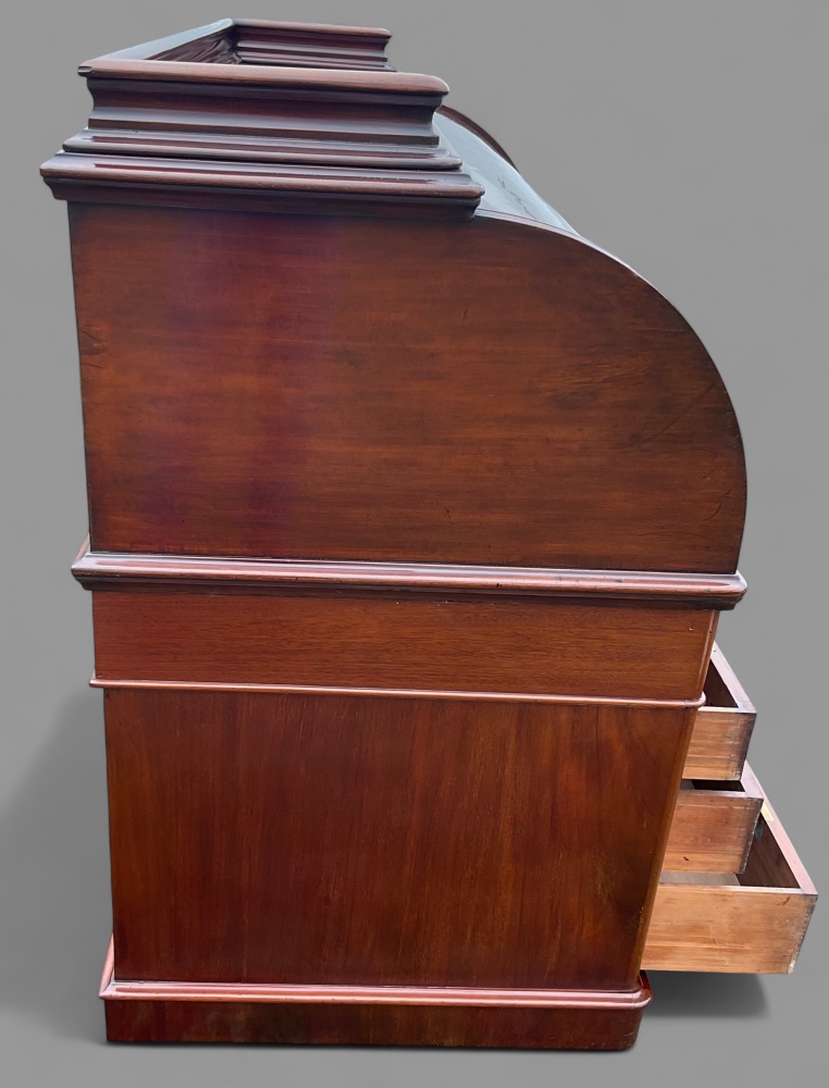 A stunning extra large Victorian cylinder desk in mahogany , the base has four drawers down either side and a single one in the middle, the upper cylinder section has the fall front in the shape of a cylinder opening to reveal a bank of six drawers and seven small compartments for letters etc , the writing platform pulls forwards and the three sections with the leather surface can be opened the centre one has a ratchet arrangement that allows it to sit in several different positions, the slide has three drawers also . The condition is superb, it is in 4 sections for ease of handling