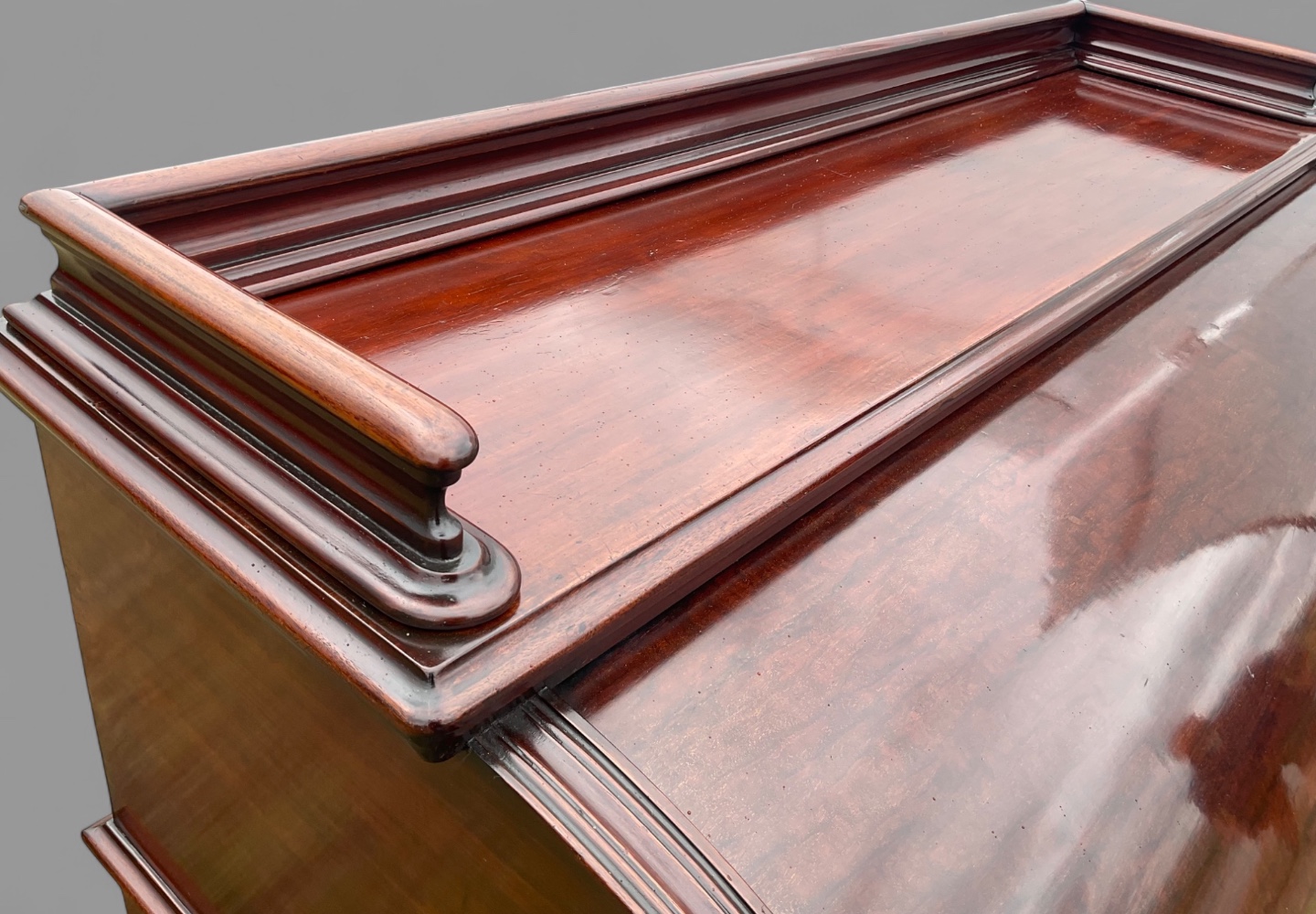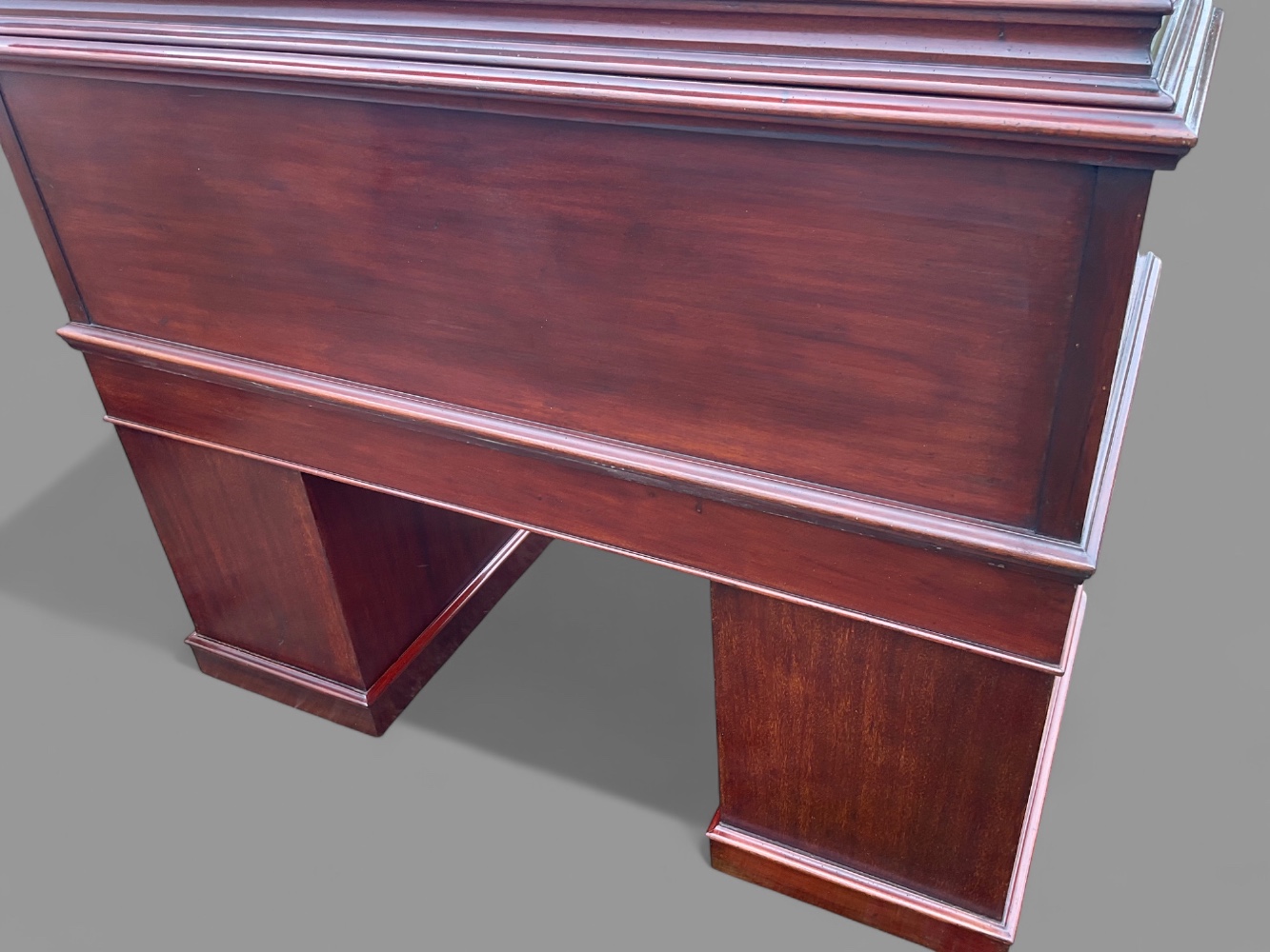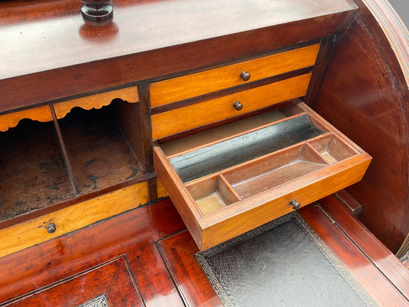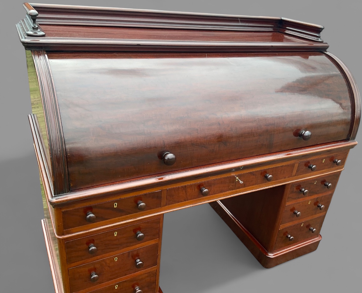 A stunning extra large Victorian cylinder desk in mahogany , the base has four drawers down either side and a single one in the middle, the upper cylinder section has the fall front in the shape of a cylinder opening to reveal a bank of six drawers and seven small compartments for letters etc , the writing platform pulls forwards and the three sections with the leather surface can be opened the centre one has a ratchet arrangement that allows it to sit in several different positions, the slide has three drawers also . The condition is superb, it is in 4 sections for ease of handling